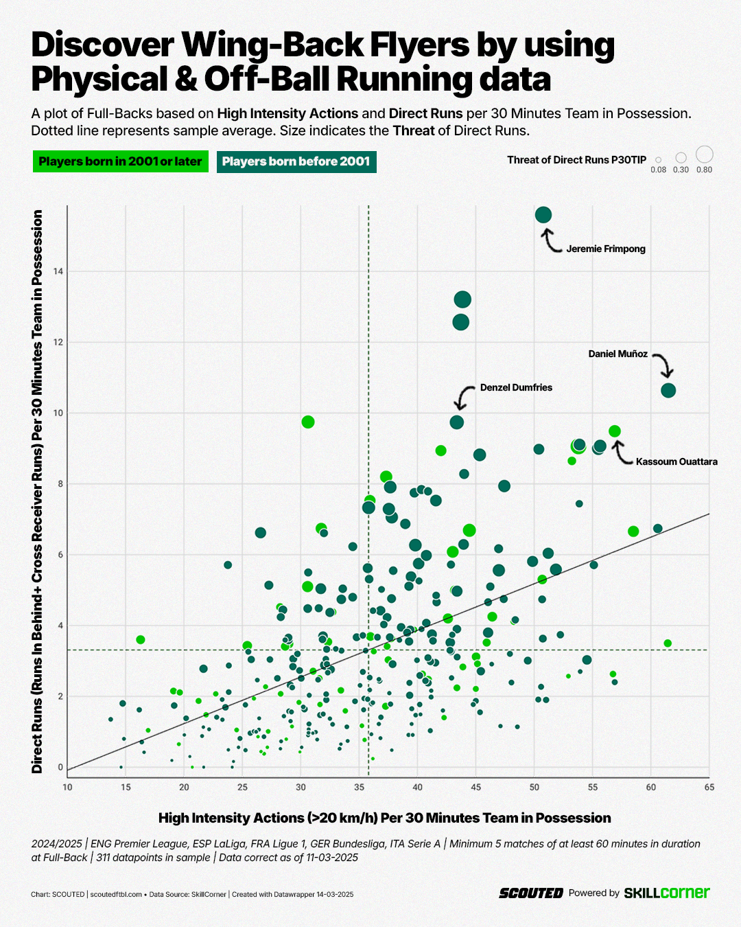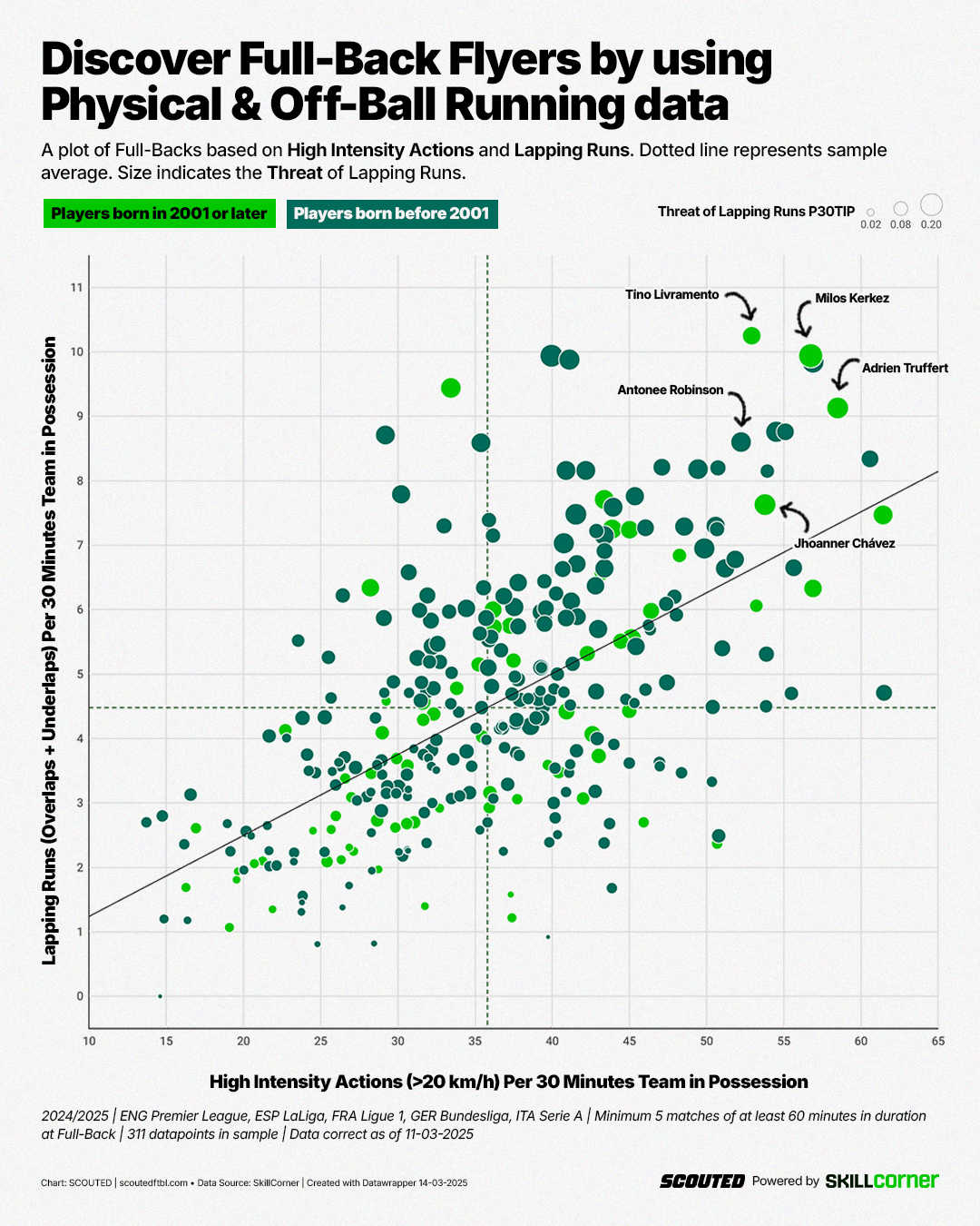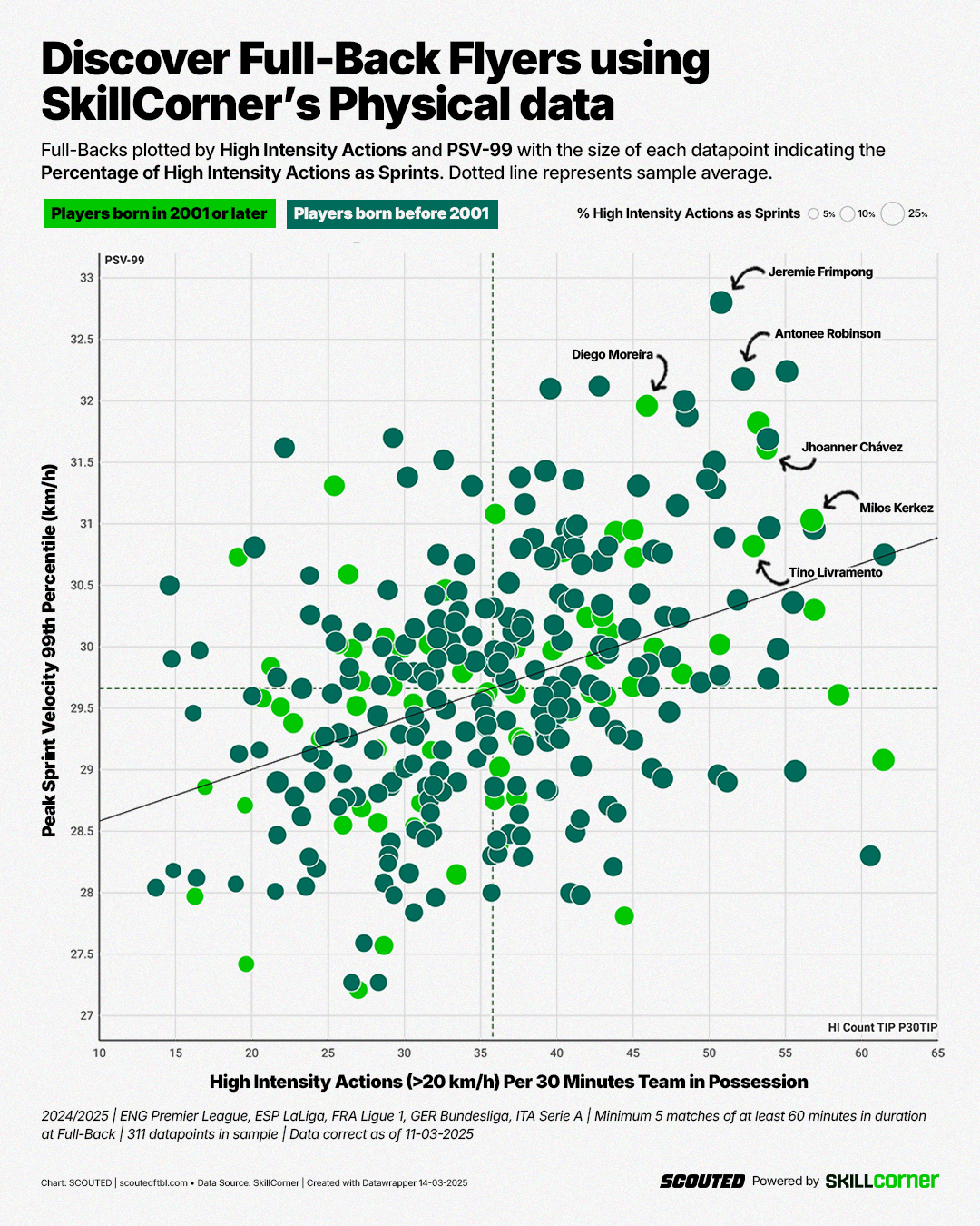 The High Speed Running (20-25 km/h) and Sprint (>25 km/h) speed bands combine to create SkillCorner’s High Intensity metric, measuring any action above the 20 km/h threshold. If we plot our Full-Back dataset using High Intensity Actions P30 TIP and Peak Sprint Velocity-99, it immediately captures both Kerkez and Robinson, perhaps the greatest exponents of the Flyer Archetype in the Premier League right now. Adjusting the size of each datapoint to the Percentage of High Intensity Actions as Sprints helped pinpoint the rocket-booted Flyers - Robinson topped this particular metric, Kerkez ranked third.