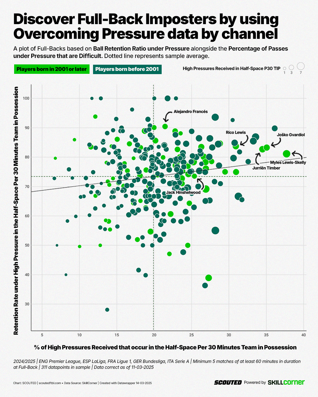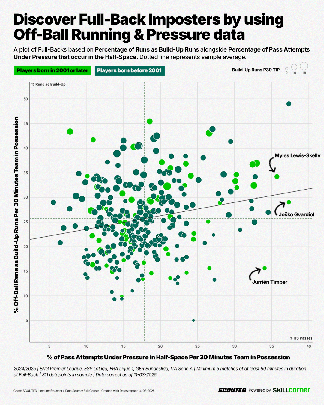 Plotting the Percentage of Runs as Build-Up Runs alongside the Percentage of Pass Attempts Under Pressure in the Half-Space helps differentiate the style of players operating in the Imposter Role. In this data visualisation, Lewis-Skelly, Gvardiol and Timber diverge.