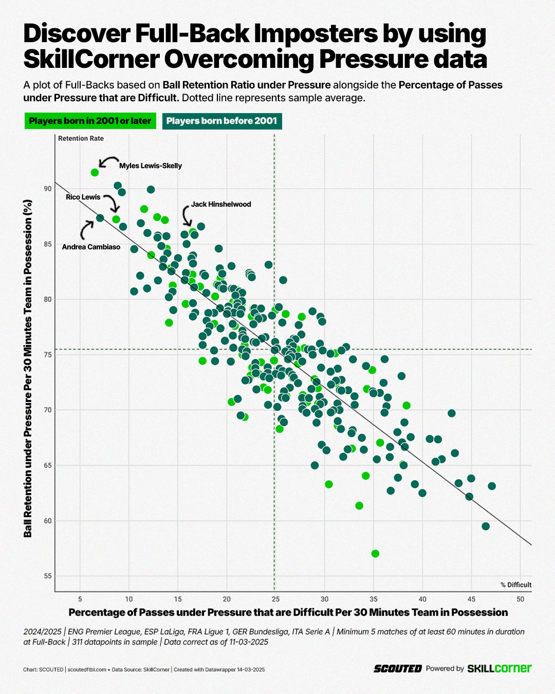 So, rather than focussing on the Danger and Difficulty of Passes as we did for the Pathfinder, we will now focus on the Full-Backs’ ability to secure possession under varying degrees of pressure. The aforementioned Lewis-Skelly ranks highest for Retention Rate and third for Retention Rate under High Pressure. The fact he is the safest passer - i.e. he has the lowest Percentage of Passes under Pressure that are Difficult - plays a part. But that is the role he is asked to fulfil.