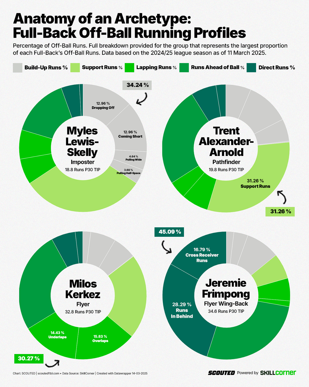 Although Support Runs and Runs Ahead of the Ball - the two most frequent Run types for Full-Backs - belong to the Progression Run Group, considering them independently enables us to hone in on stylistic differences due to their diverging origin points. For Full-Backs, and the Flyer Archetype in particular, it is important to combine Overlaps and Underlaps into Lapping Runs and to separate this sub-group from the Progression umbrella. As you will see, each Archetype becomes synonymous with an entire Run Group or, at the very least, a particular Run type within that group.