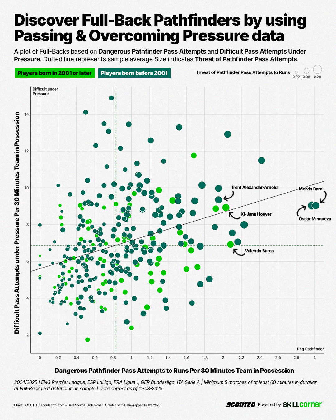 The Pathfinder Archetype is the high-risk, high-reward passer. So, in order to identify Full-Backs that are relentless and fearless in their attempts to seek out advanced teammates running into space, we can look at Dangerous Pathfinder Pass Attempts alongside Difficult Pass Attempts under Pressure. Ironically, it appears that a previous Trent Alexander-Arnold understudy, Ki-Jana Hoever, could be a Pathfinder protégé. The former Liverpool full-back is currently on loan at Auxerre from Wolves.