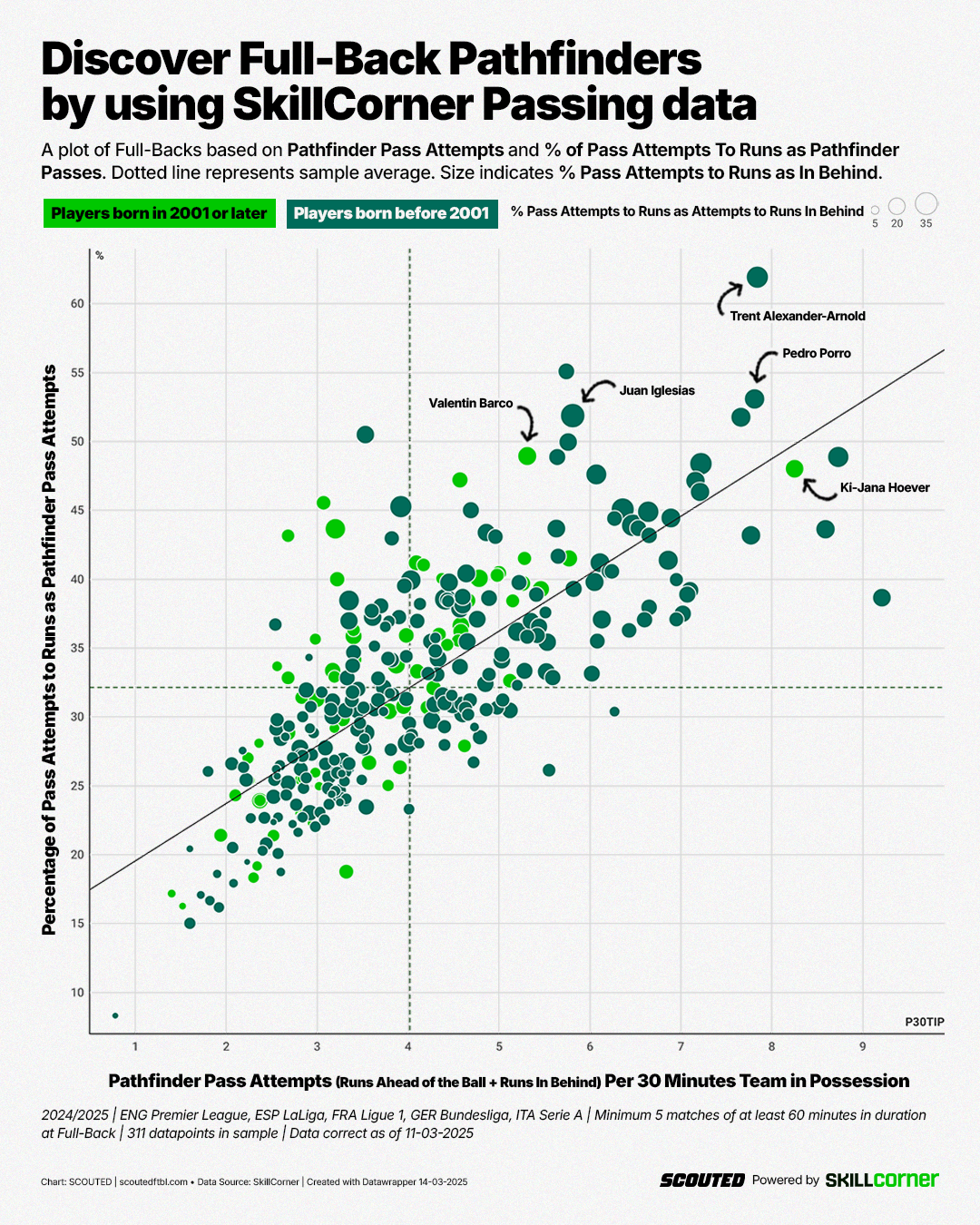 Of course, his increased Opportunities to Pass to these Runs is likely influenced by Liverpool’s style, but it highlights the concentration of his Passing profile. 61.4% of his Pass Attempts P30 TIP are what we will refer to from now on as Pathfinder Passes, a combination of Passes to Runs Ahead of Ball and Passes to Runs In Behind - this is the highest concentration of Pathfinder Pass Attempts in our dataset. So, to discover stylistic matches, we can plot the volume of Pathfinder Passes with the Percentage of Passes to Runs that are Pathfinder Passes. However, due to Pass Attempts to Runs Ahead of the Ball or Support Runs making up a decent chunk of all Full-Back Passing profiles, adjusting the size of each datapoint to the Percentage of Pass Attempts to Runs In Behind helps uncover the more direct, expansive Pathfinders, like Alexander-Arnold - 29.6% of his Pass Attempts to Runs are Pass Attempts to Runs in Behind.