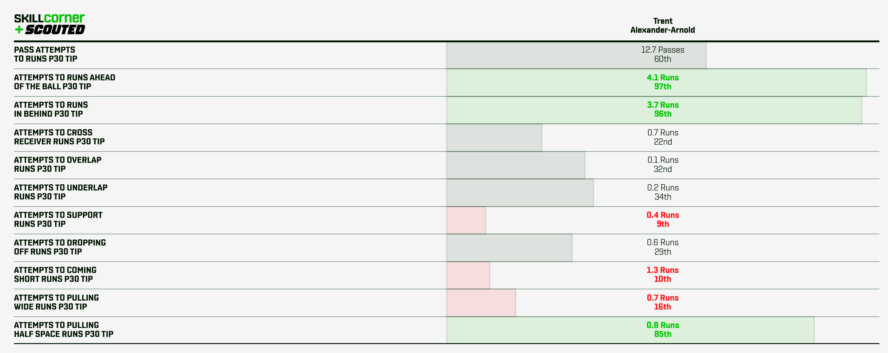 To show the value of focussing specifically on these groups, let's take a look at Trent Alexander-Arnold. When looking at his Passes to All Runs, he ranks in the 59th Percentile for Attempts. However, when focusing on Runs In Behind and Runs Ahead of the Ball, he becomes a top 5% player.