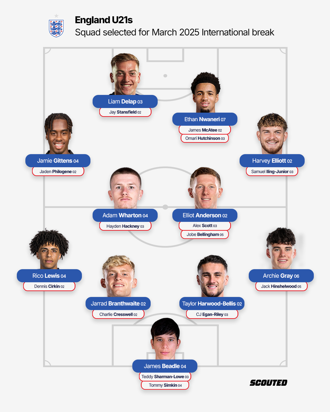 Carlsey was criticised for deploying his Strikerless 4-4-2 in a 1-2 Wembley defeat to Greece during his spell in charge of the senior squad but I hope it returns at this level. That being said, the presence of Liam Delap (2003) means that at least one of the two advanced slots will be occupied by a bonafide Power Forward. Next to him - and perhaps slightly more reserved - we could see Delap’s Ipswich Town teammate Omari Hutchinson (2003) or former Manchester City teammate James McAtee (2002). However, I think this role is tailor-made for Ethan Nwaneri (2007).