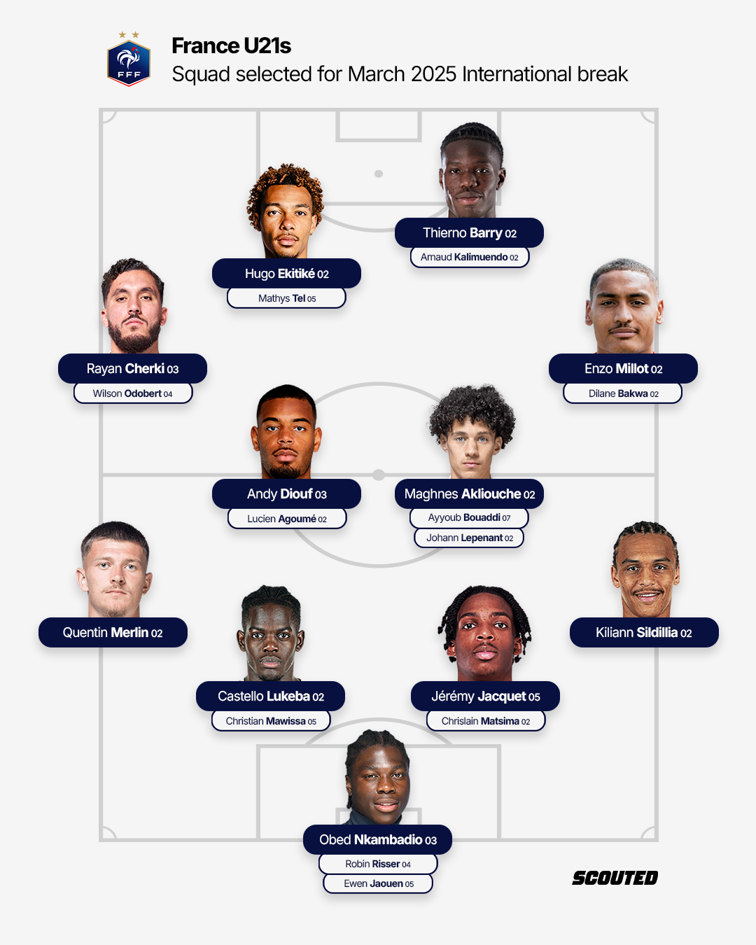 That’s because Hugo Ekitiké (2002) is in the U21 squad. That seems unfair. Pairing this Isak regen with the giraffe-sized Barry would be a very meta centre-forward pairing. Behind them, France are again spoilt for choice with Rayan Cherki (2003) another bonkers name to see at this level. I hope to see Dilane Bakwa (2002) get a start, too.
