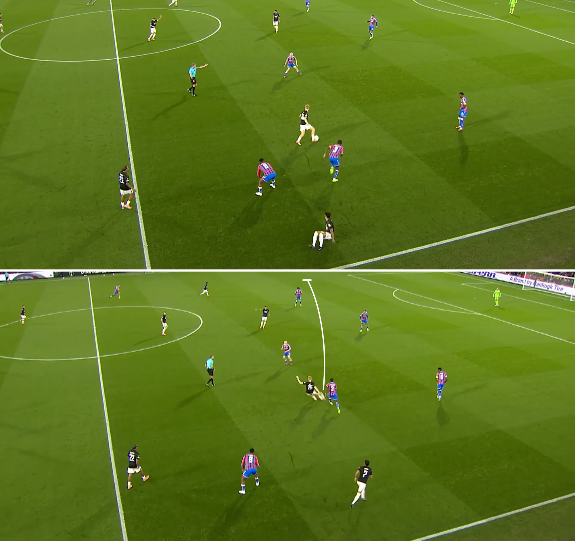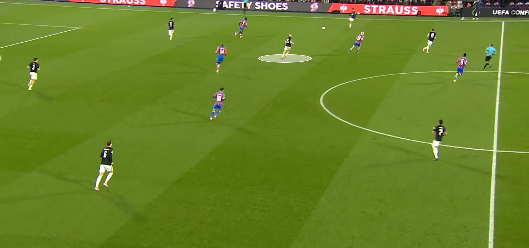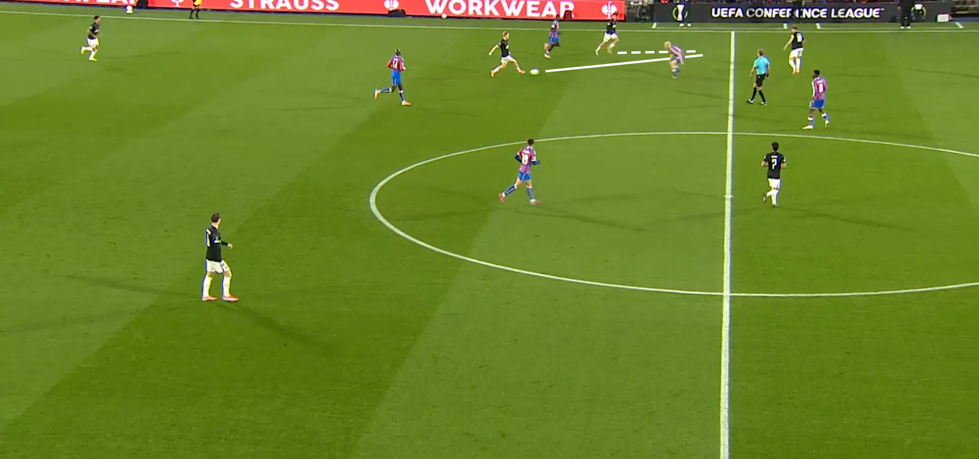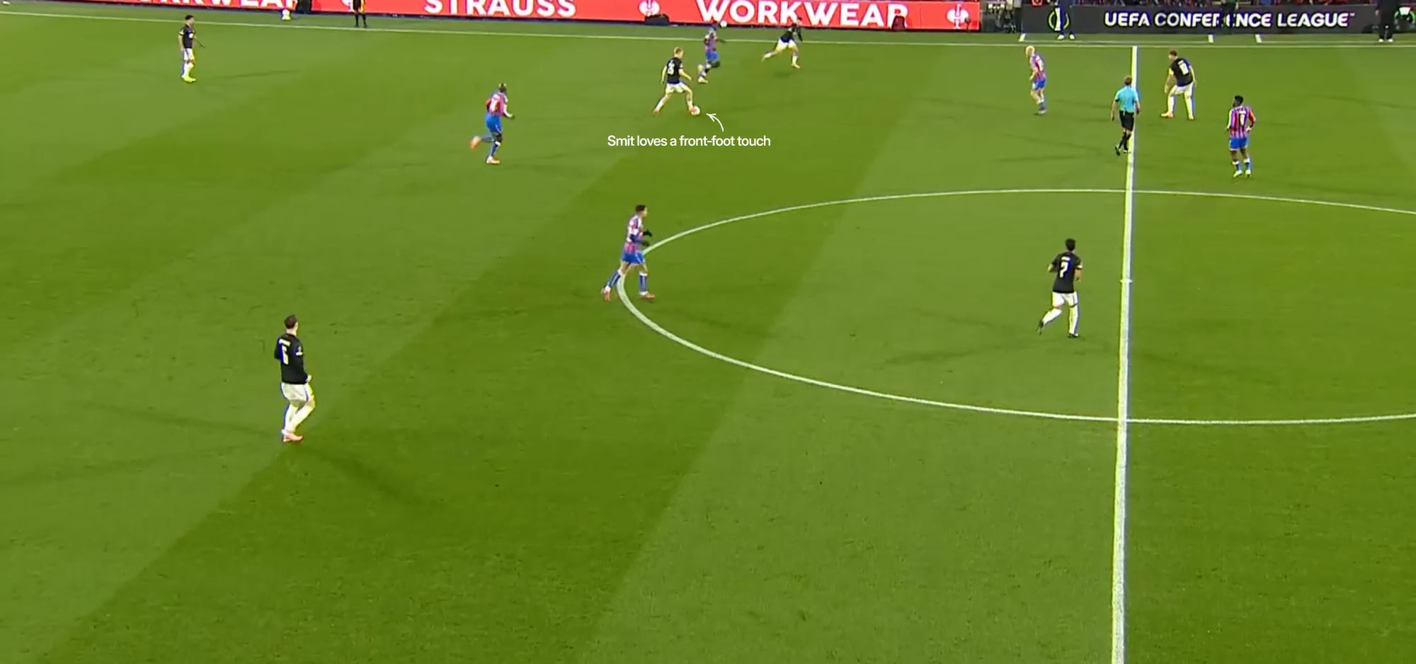 Join the clubThis movement is facilitated by constant scanning. Smit’s head is constantly swivelling, reading the space around him. Here he is one minute into the game at Selhurst Park, rolling deep to provide his left-back an option: