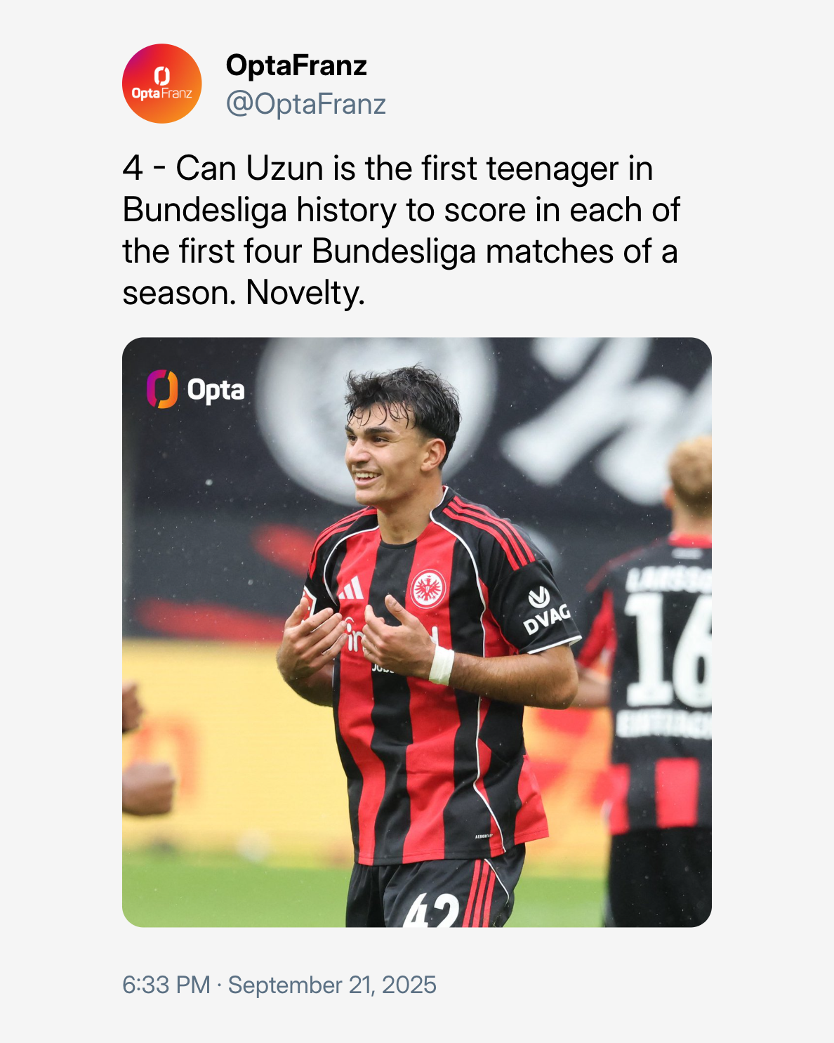 Thanks to OptaFranz, we know Can Uzun is the first teenager in Bundesliga history to score in each of the first four matches of a Bundesliga season.