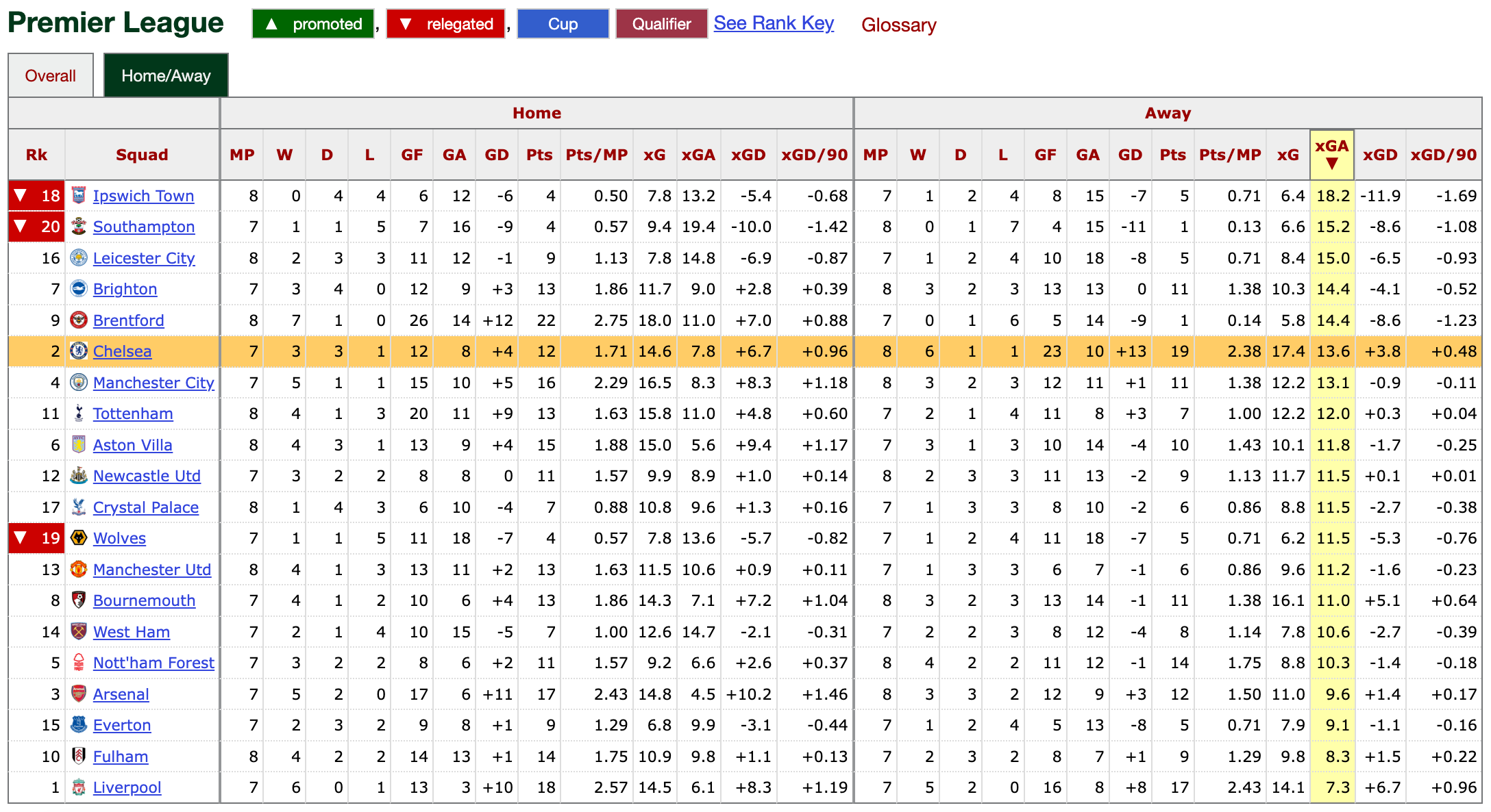 Chelsea rank 11th for Expected Goals Against. Of course, you could immediately riposte by stating their Expected Goal Difference is the 5th best in the league and their attacking prowess supersedes this concern. However, I would argue that conceding 1.4 xG a game is going to cause issues sooner rather than later.