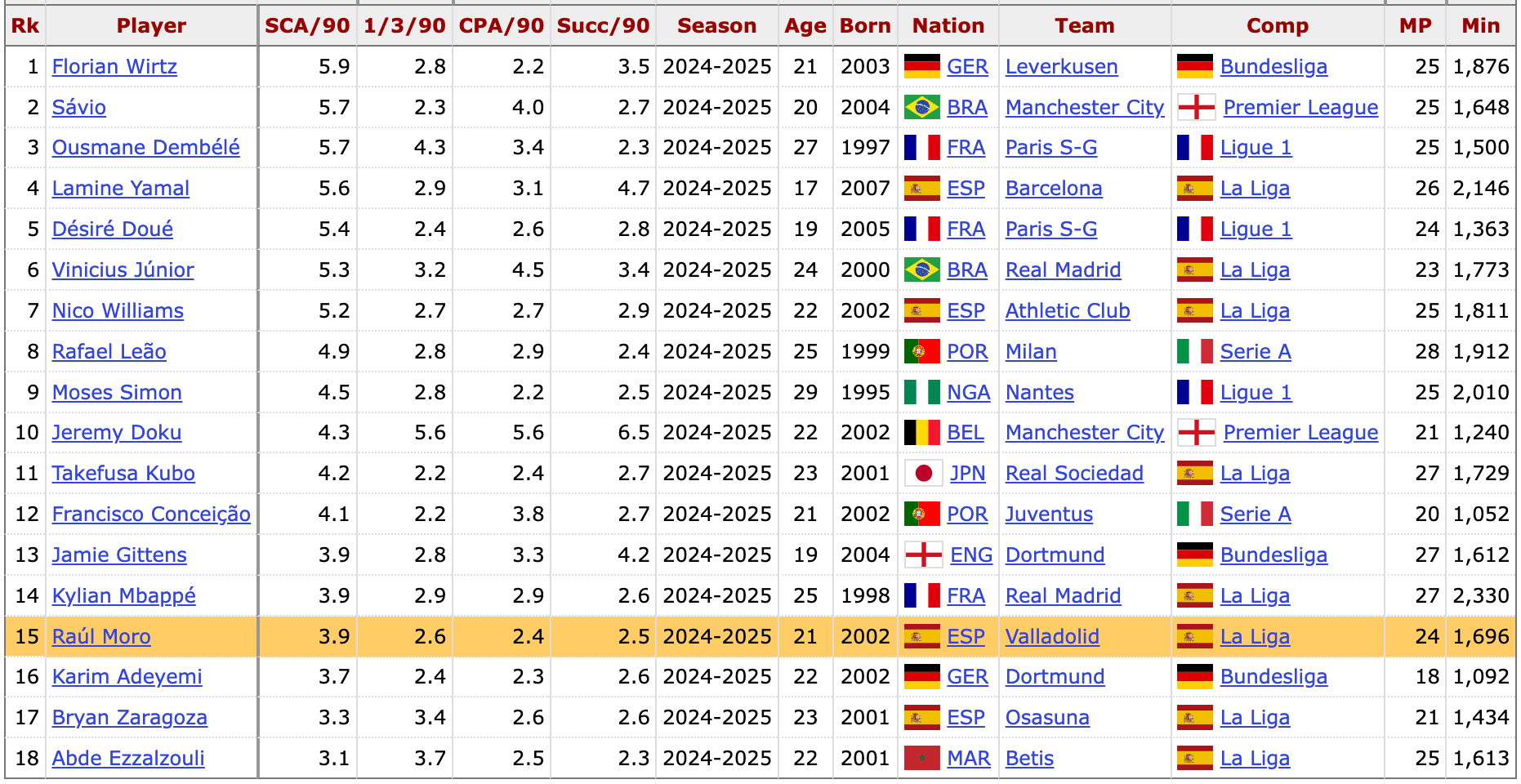 Raúl Moro is one of the most electrifying wingers in sports entertainment. He has the One-Man Army role in a struggling Real Valladolid team, putting up huge dribble and carry numbers as a result. Moro is one of 18 players with 900+ minutes, across all ages, to average 2.2 Carries into the Final Third, 2.2 Carries into the Penalty Area and 2.2 Successful Take-ons across Europe’s Big Five Leagues this season. I am currently working on Winger Archetypes for my next SkillCorner piece and let’s just say that Nottingham Forest should be placing a bid...yesterday.