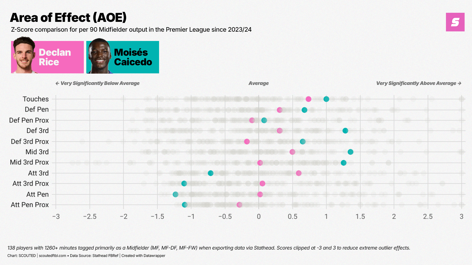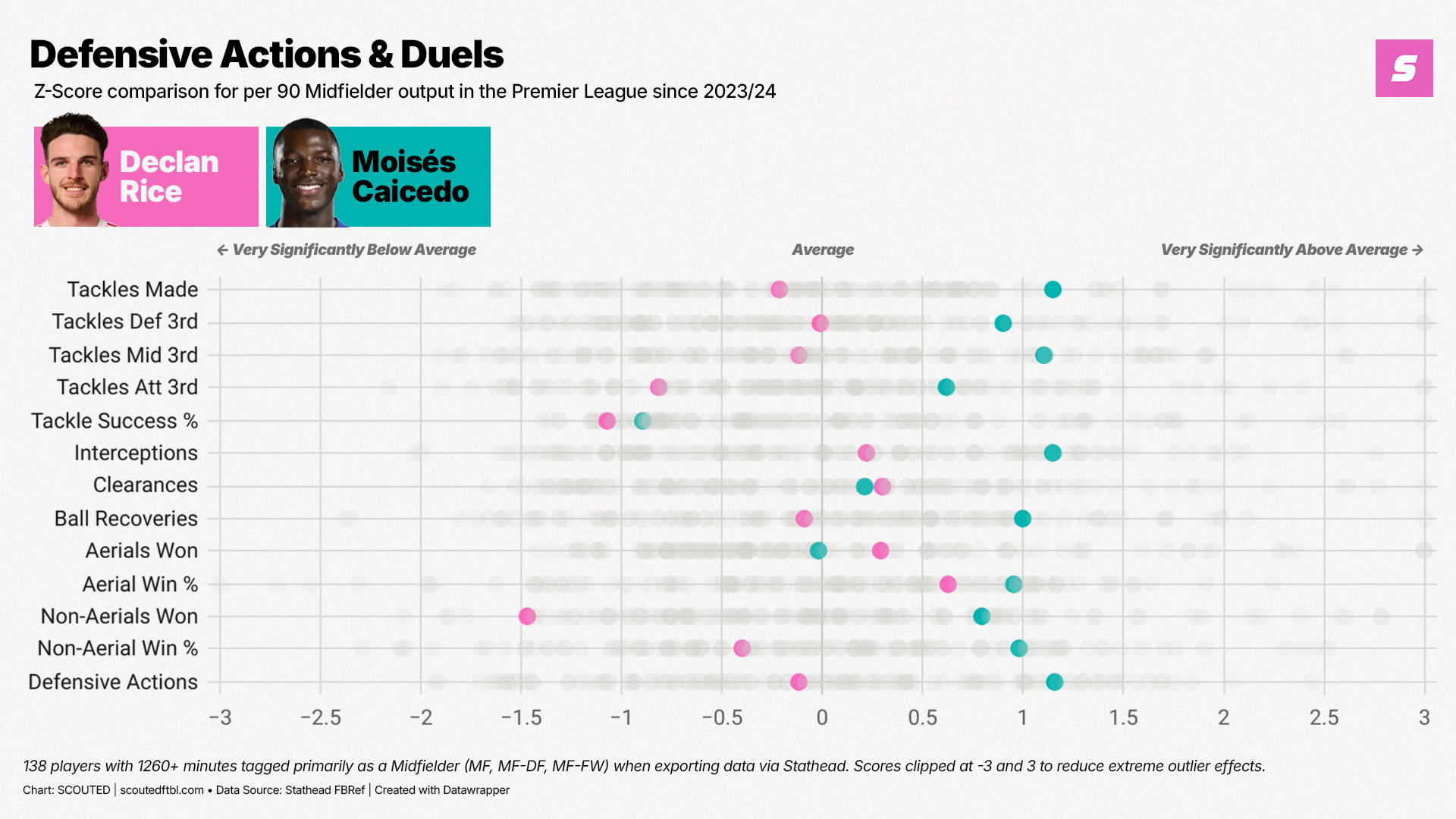 In fact, Caicedo is such a rampant ball-winner that he does rank above average for Tackles in the Attacking Third. But his principal AOE remains the Middle Third. He also nips away the ball more often than Rice in most other defensive actions, including the composite metric of Tackles, Interceptions, Blocks, Ball Recoveries and Clearances.