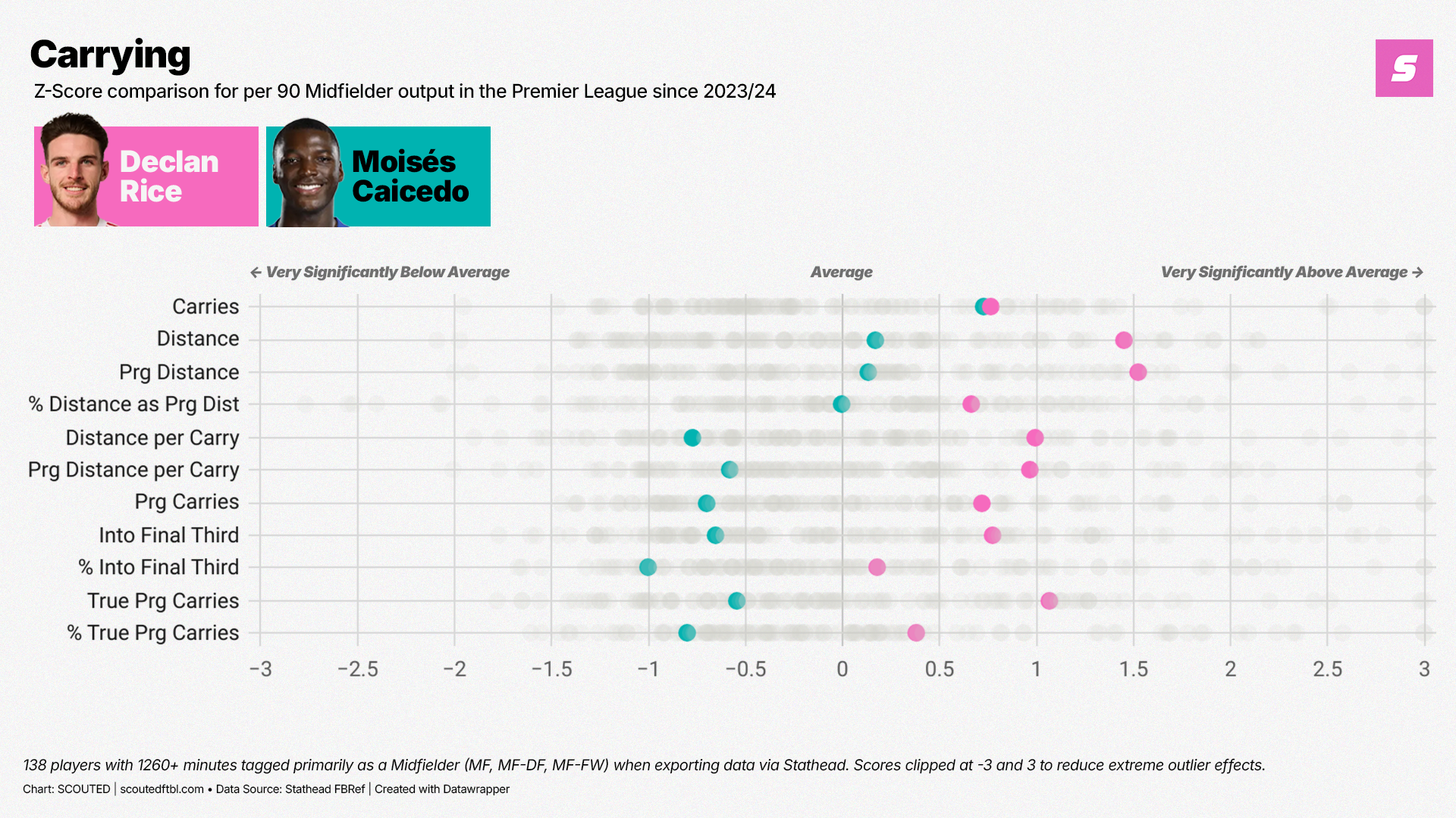 This separates the crabs from the horses. Despite Rice and Caicedo having a near-identical score for Carries - which correlates extremely closely to Touches - Rice distances himself from Caicedo in most other metrics.