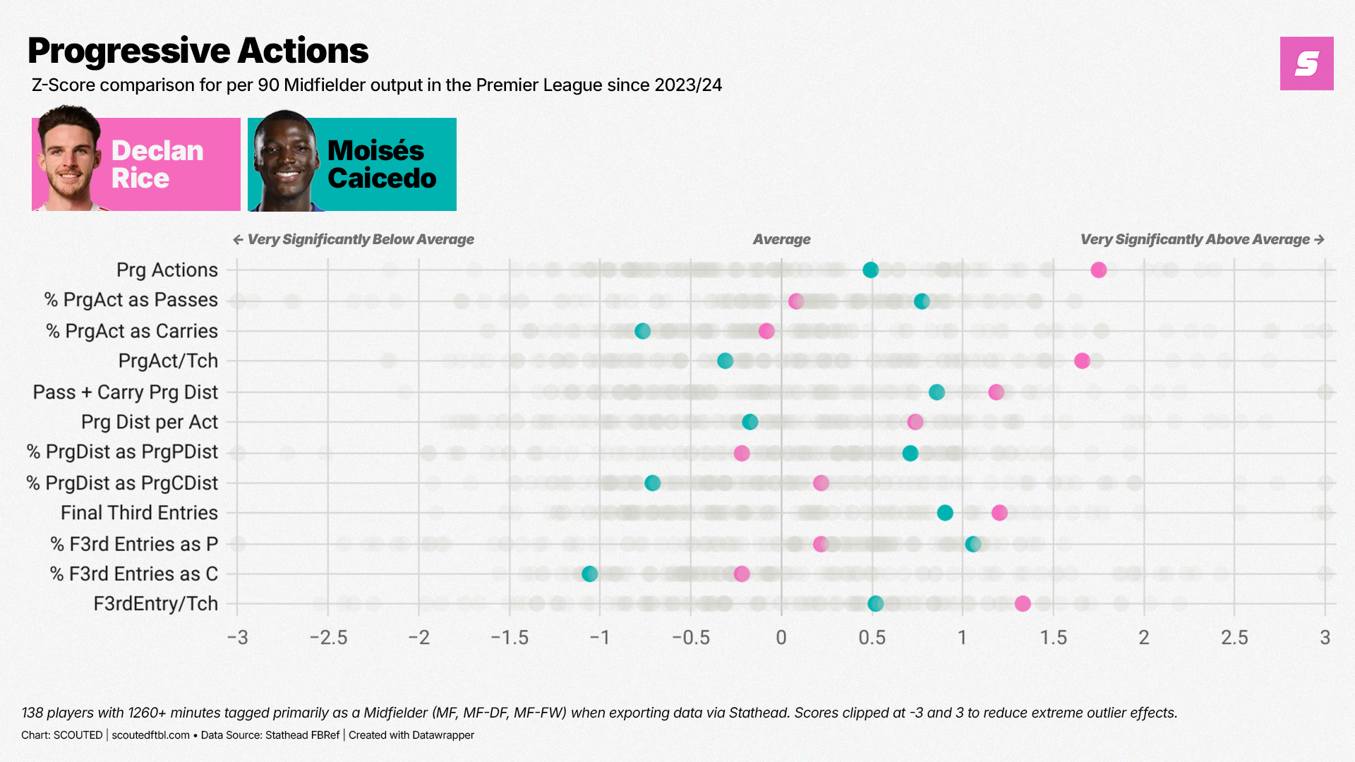 True Progressive Passes are all Progressive Passes excluding Passes into the Penalty Area, counting all “completed passes that move the ball towards the opponent's goal line at least 10 yards from its furthest point in the last six passes”. Both Rice and Caicedo rank above average for output, but Rice is moving towards the significant end of the spectrum; his 1.44 Score is the highest for either player across all metrics on this graph.