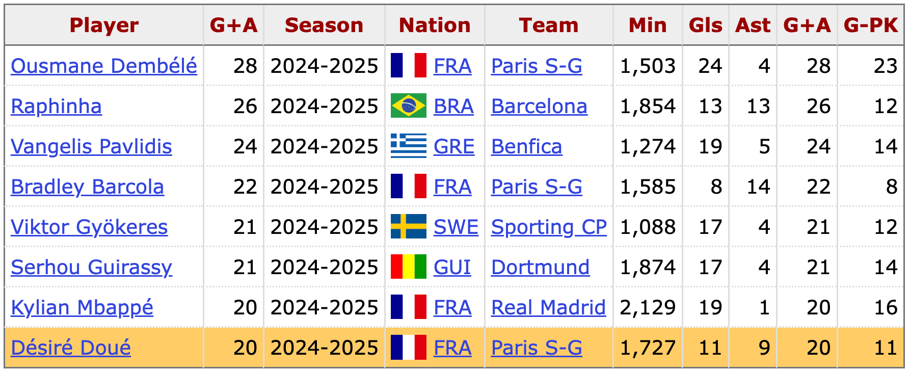 Following his goal against Le Havre at the weekend, Désiré Doué became one of eight players from across Europe’s top seven leagues to be directly involved in 20+ goals across all competitions in 2025.
