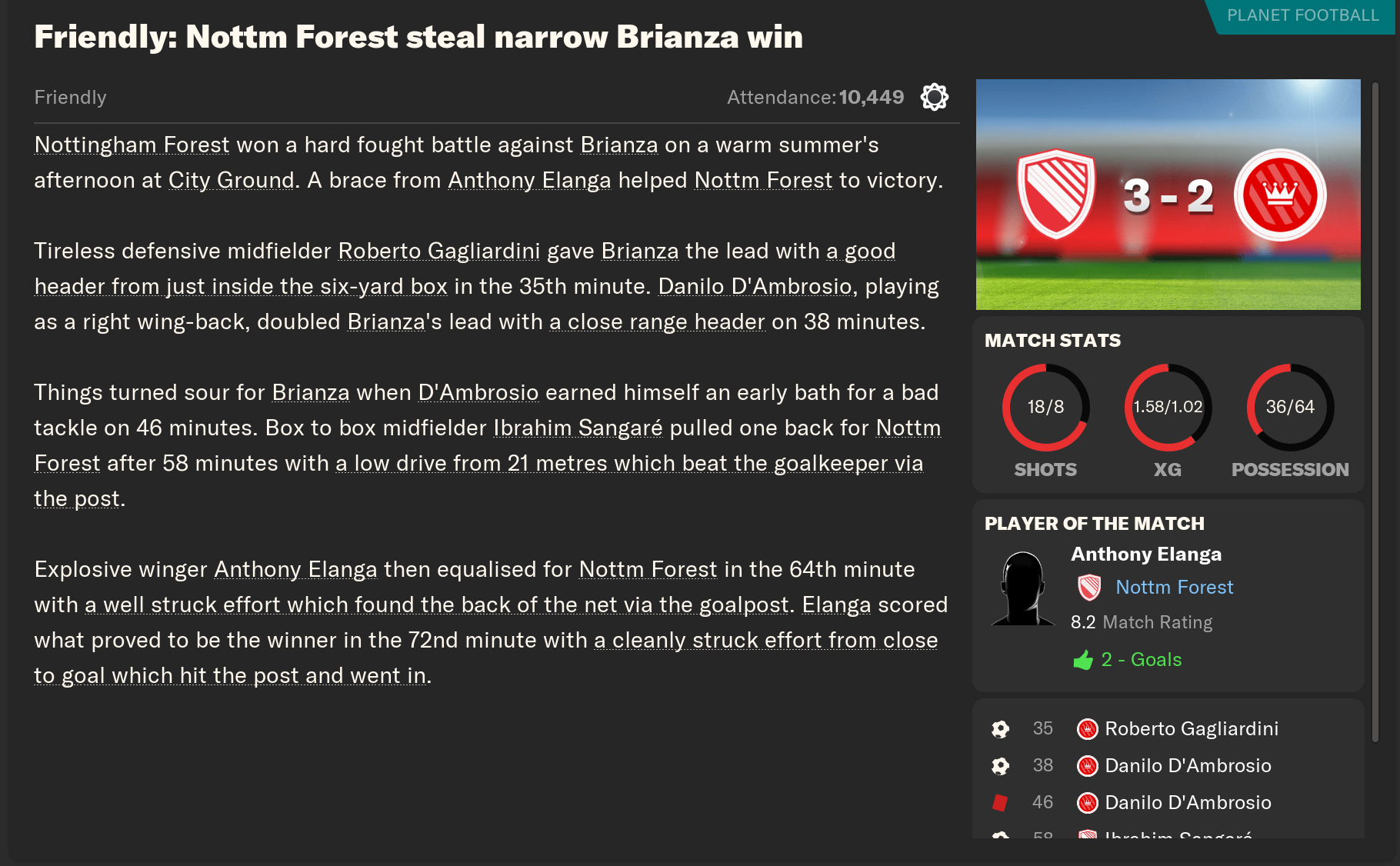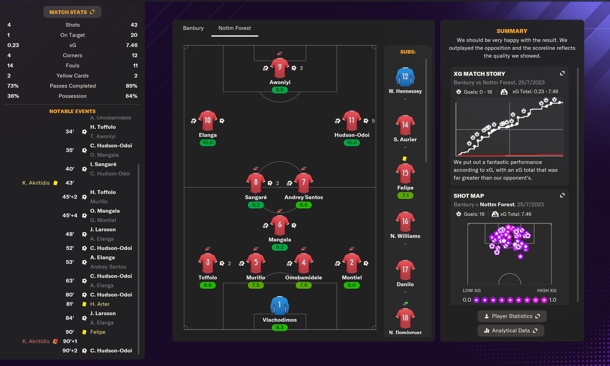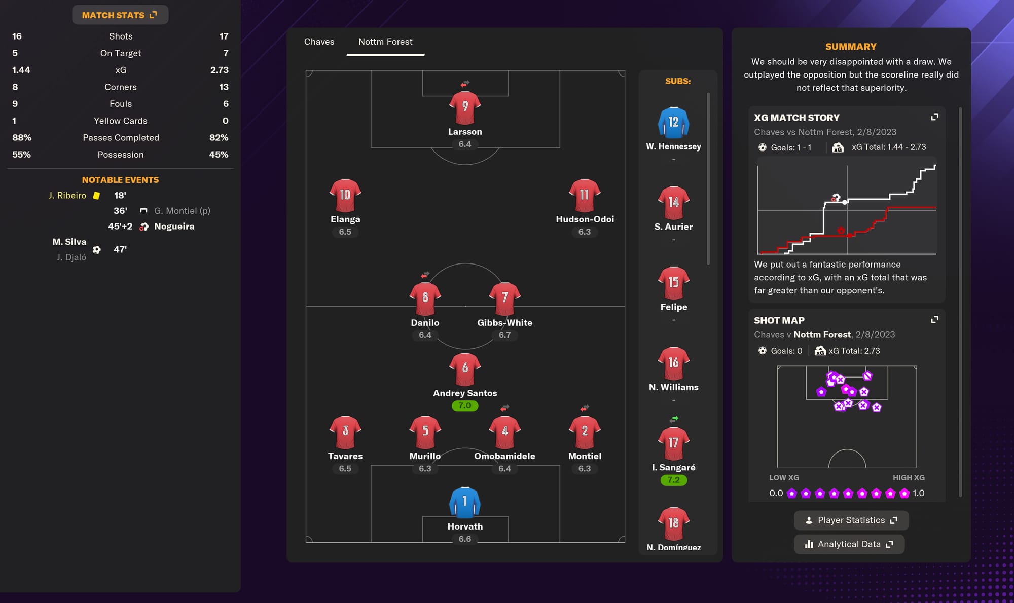 My logic is solid, my execution questionable. Without warning, I fiddled with Felipe’s status in the team, relegating him from key to squad player. Look, I’m trying to build this team around a core of youth - this is SCOUTED, not AGED - and I have many options at centre-back I’d like to explore. Murillo is a guaranteed starter, he’s too fun. Omobamidele looks talented and has impressed so far, and Scott McKenna and Moussa Niakhaté are prime age. Plus, Felipe’s contract expires next summer. He’s 33, and respected, yes - but he won’t get the minutes befitting his nomenclature.