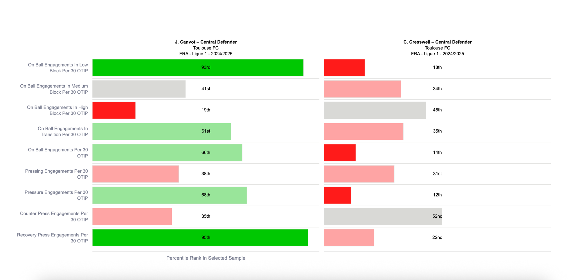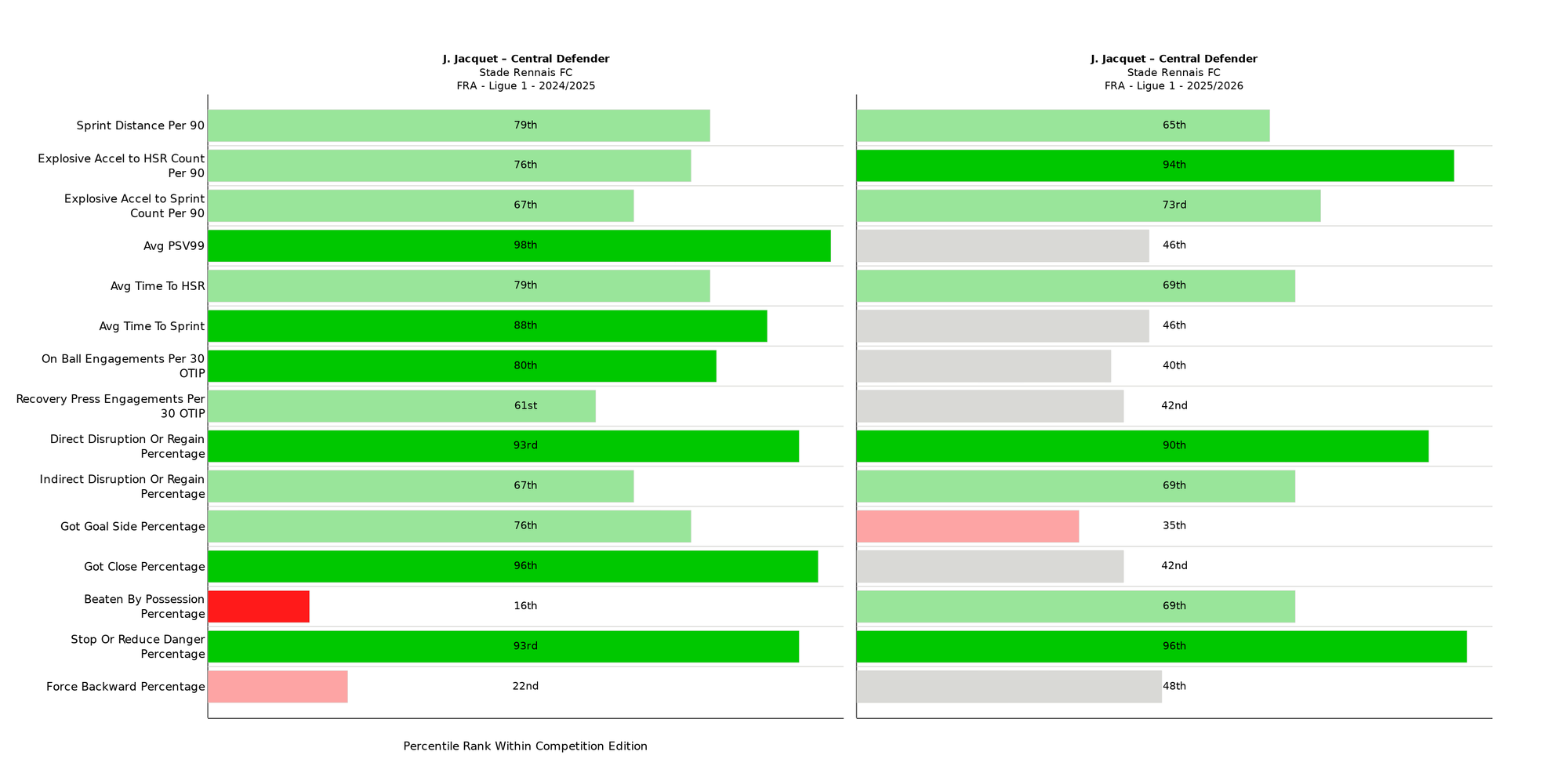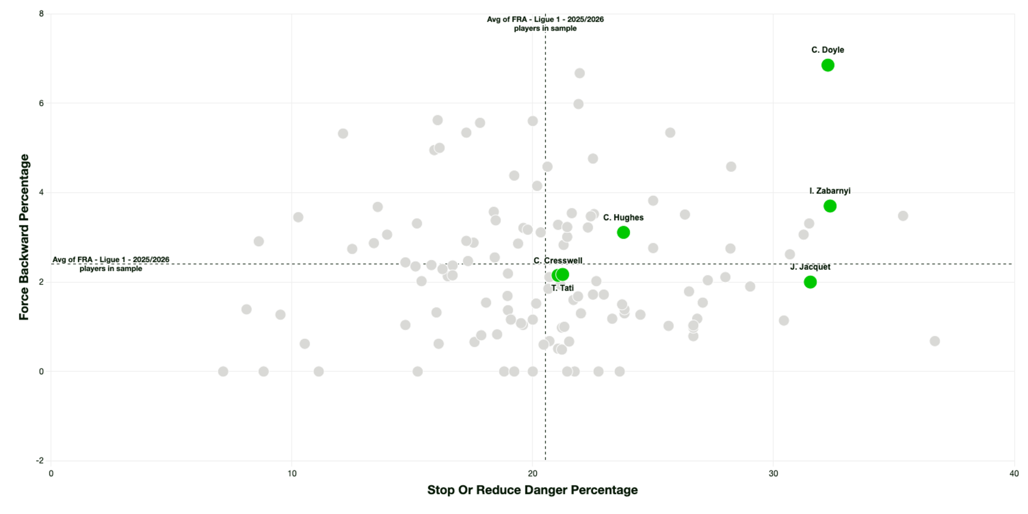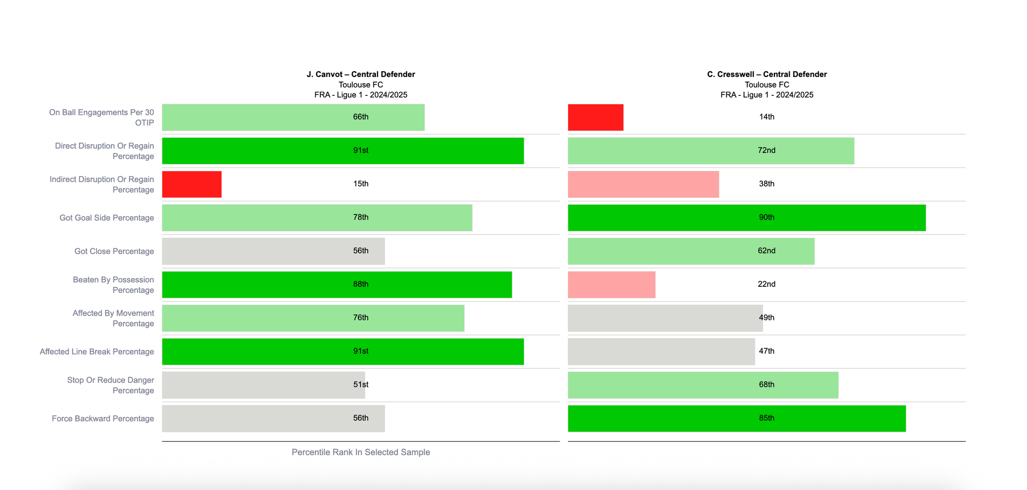 Jacquet’s top 10% ranking for PSV-99, Direct Disruption Percentage and Got Close Percentage indicates his effectiveness and efficiency in a proactive or recovery role. Unlike Canvot, however, he also displayed shield-like qualities, with a 93rd percentile ranking for Stopping of Reducing Danger.