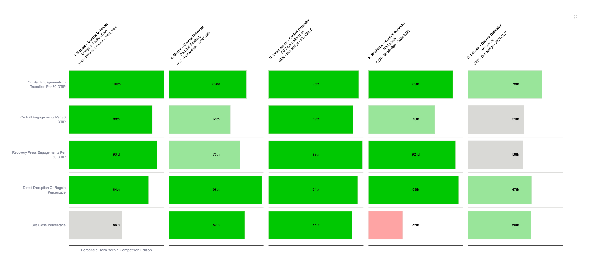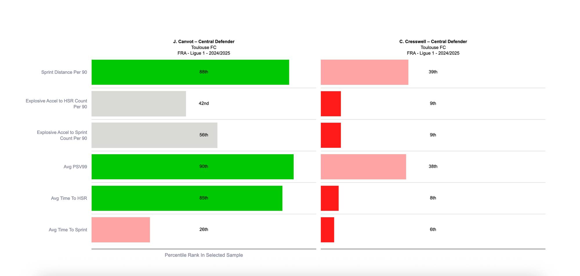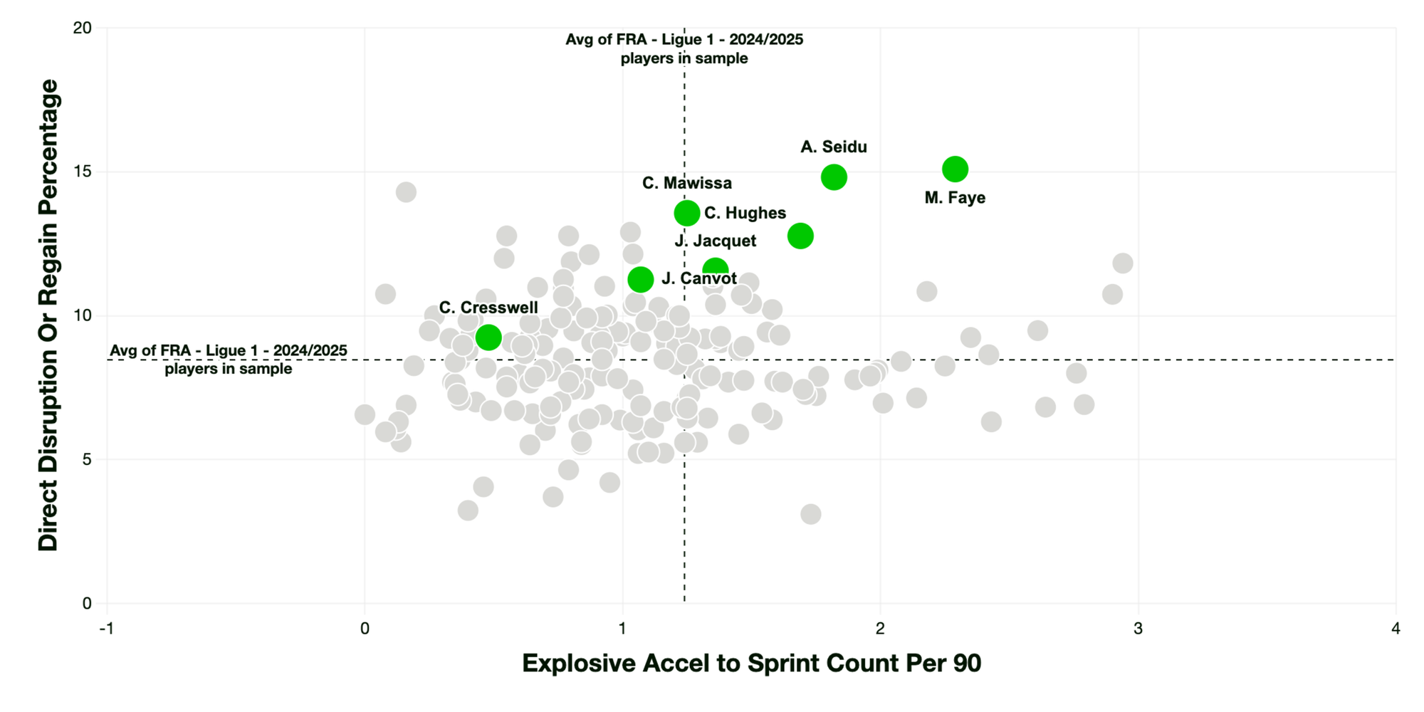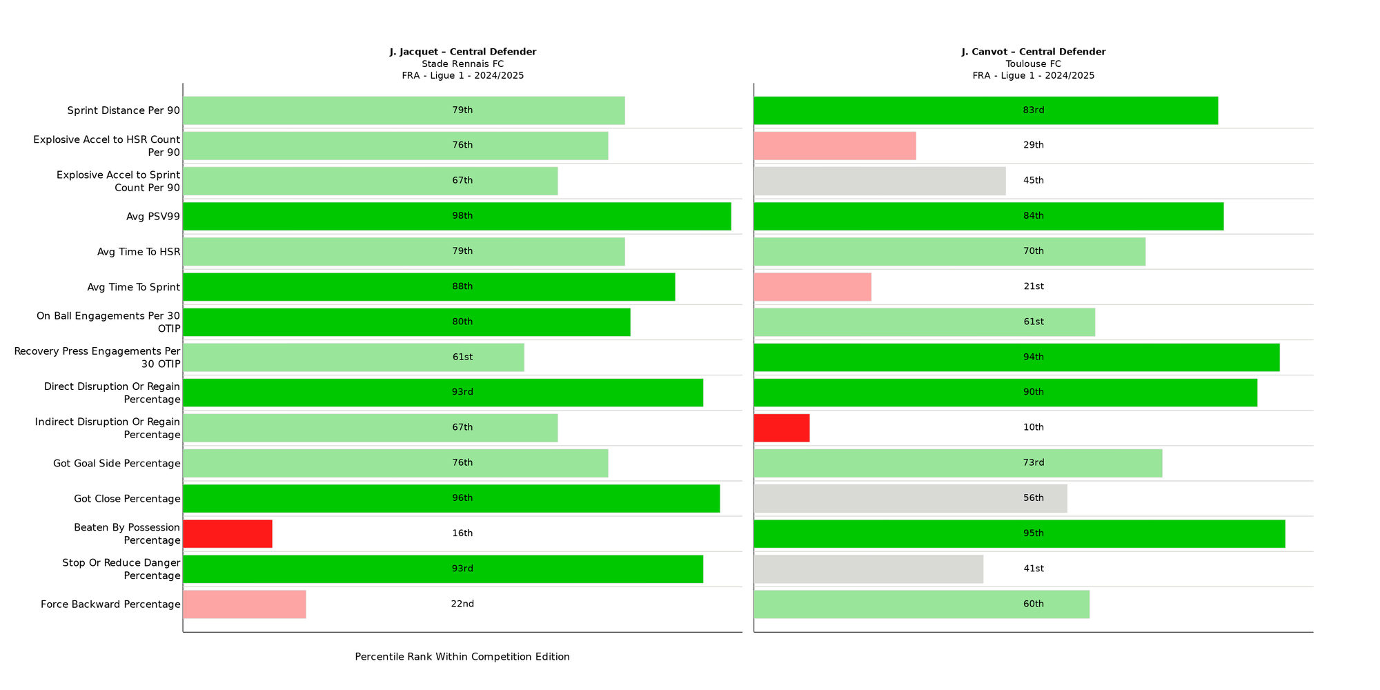 Jacquet’s top 10% ranking for PSV-99, Direct Disruption Percentage and Got Close Percentage indicates his effectiveness and efficiency in a proactive or recovery role. Unlike Canvot, however, he also displayed shield-like qualities, with a 93rd percentile ranking for Stopping of Reducing Danger.