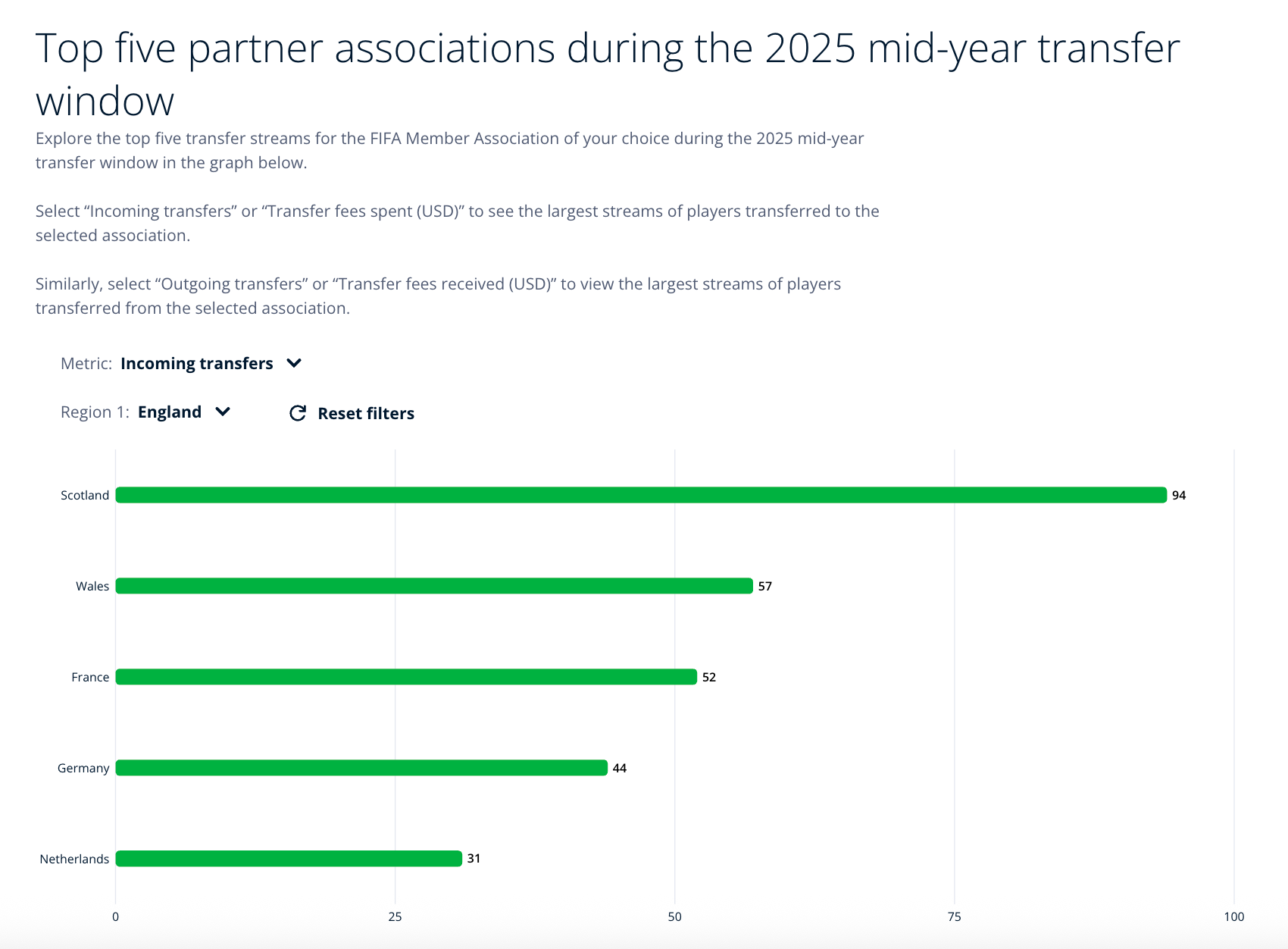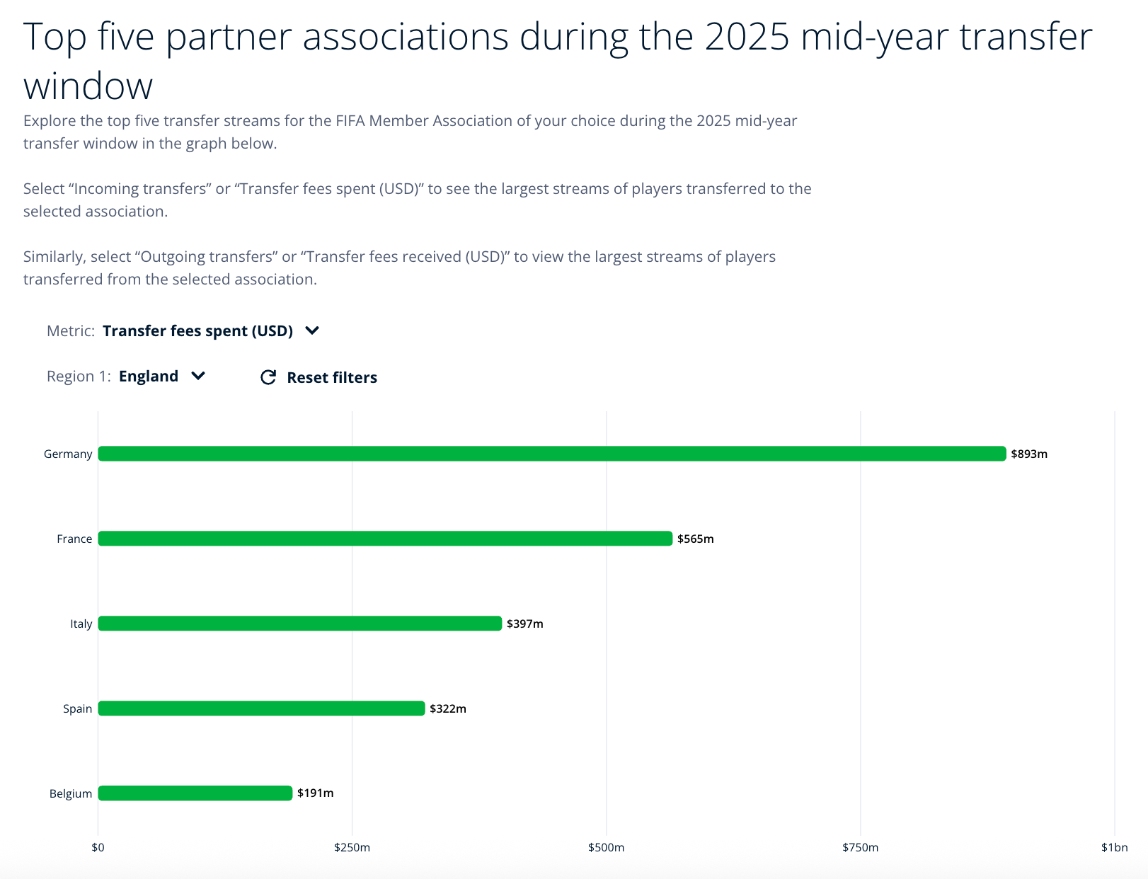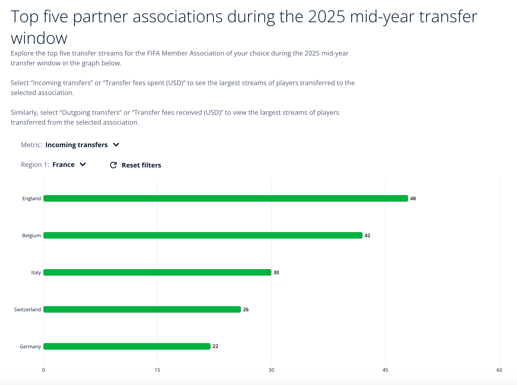 England represents France’s primary market for incoming transfers both in terms of the number of signings and spending. FIFA reports 48 incoming transfers at a spend of $326m. France did not spend more than $52.8m in any other partner association.