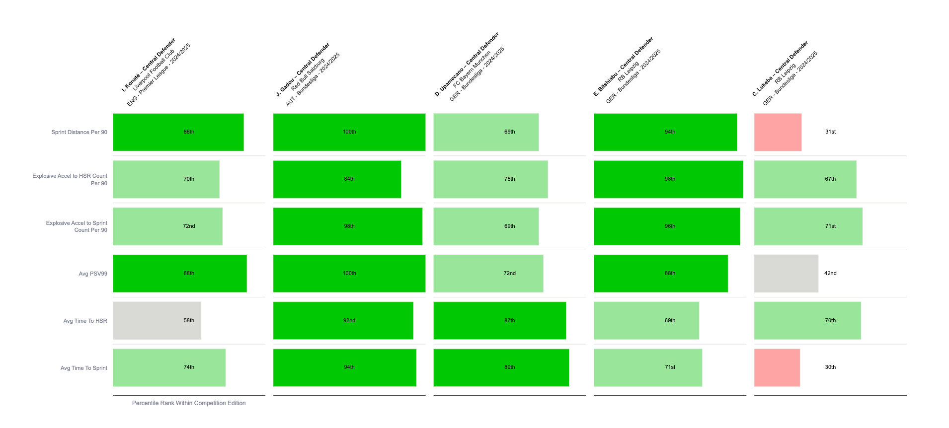 Dialling in on the Physical attributes that best-equip a centre-back for the spear-like role, four of those five Red Bull alumni profile as effective exponents of that profile when ranked within the context of their own divisions in 2024/25.