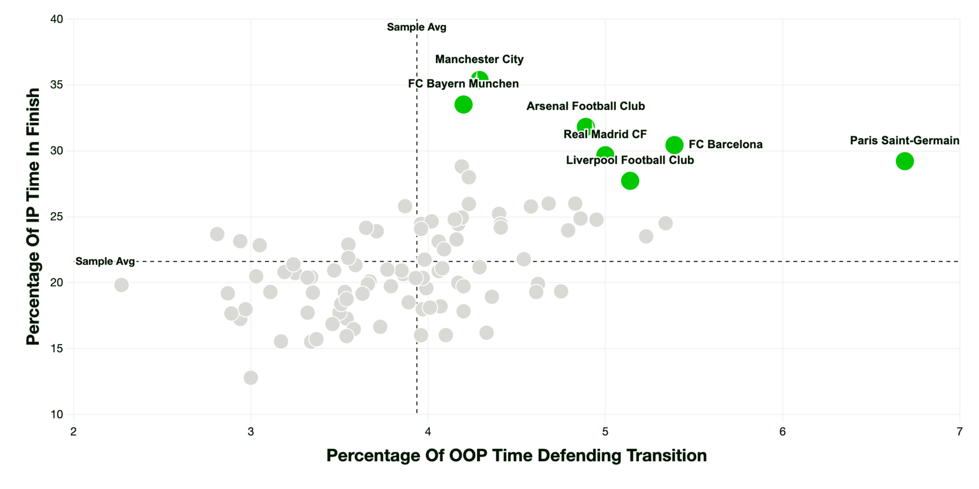 As you might expect, spears are an important profile for hyper-dominant teams like Manchester City, Liverpool, Arsenal, PSG and Bayern. The teams that spend a larger proportion of time in the final third, leaving fields of open grass behind them - the teams that have the most money.