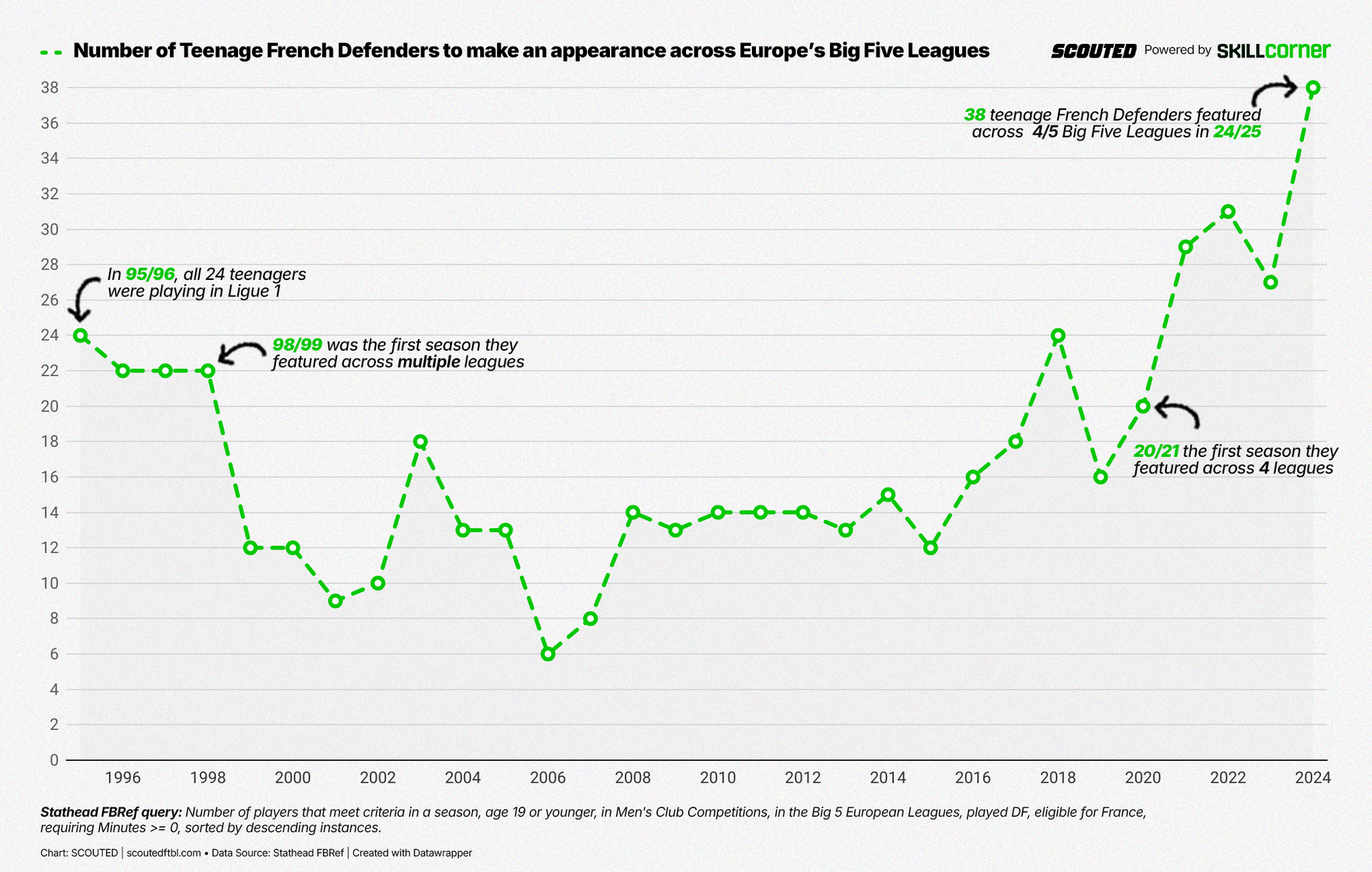 During the 2024/25 season, 38 teenage defenders (based on their position as defined by Stathead FBref) made at least one appearance across the big five leagues - at least seven more than any other season in the modern era. In terms of minutes given to these players, Ligue 1 blows the Big Five Leagues out of the water.