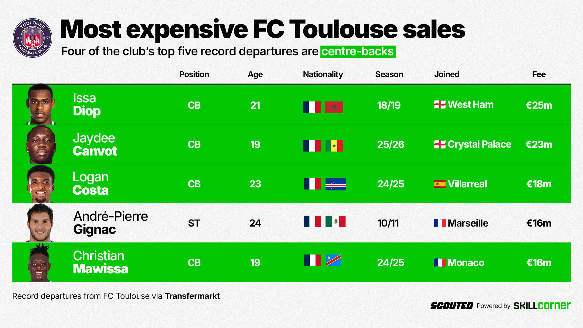 Toulouse are at the forefront of centre-back development. Four of their top five most expensive exports are centre-backs. All four were sold at the age of 23 or younger. Issa Diop and Christian Mawissa were born in the southern region of Occitania, of which Toulouse is the prefecture. But Costa and Canvot were born in the Île‑de‑France.
