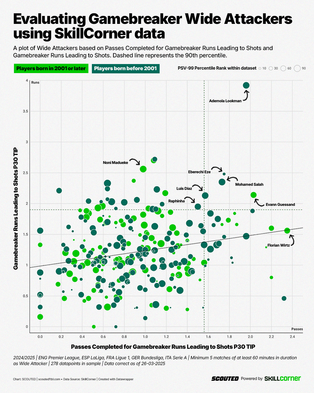 In this dataset of 278 Wide Attackers across Europe’s Big Five Leagues, only five players rank in the top 10% for Gamebreaker Runs Leading to Shots and Passes Completed for Gamebreaker Runs Leading to Shots:
