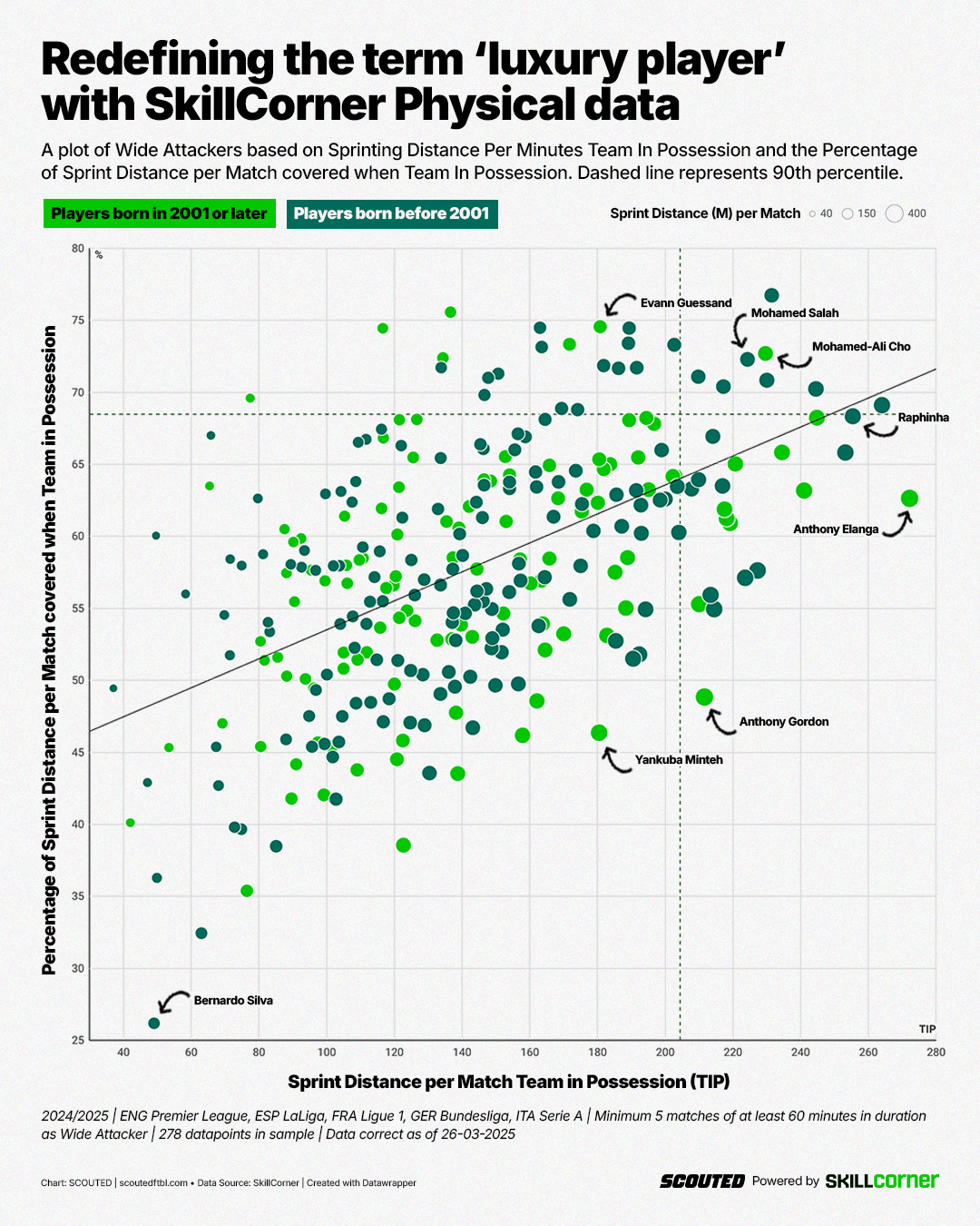 Well, one of my initial theories for the profile included a way to paint ‘luxury’ players in a positive light - or at the very least, not a negative one. In the world of SCOUTED Archetypes, luxury could come to mean a player that saves their Physical output for In Possession (TIP). This does not necessarily mean they cannot or will not contribute Out of Possession (OTIP), but rather their merit in attack is so valuable that maximum effort is reserved for those moments. Salah’s data supports this theory.