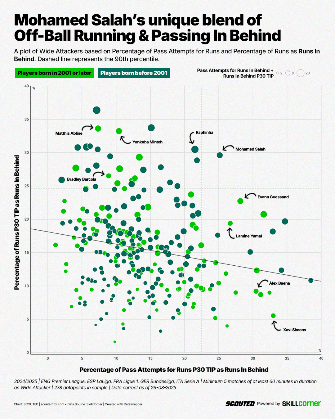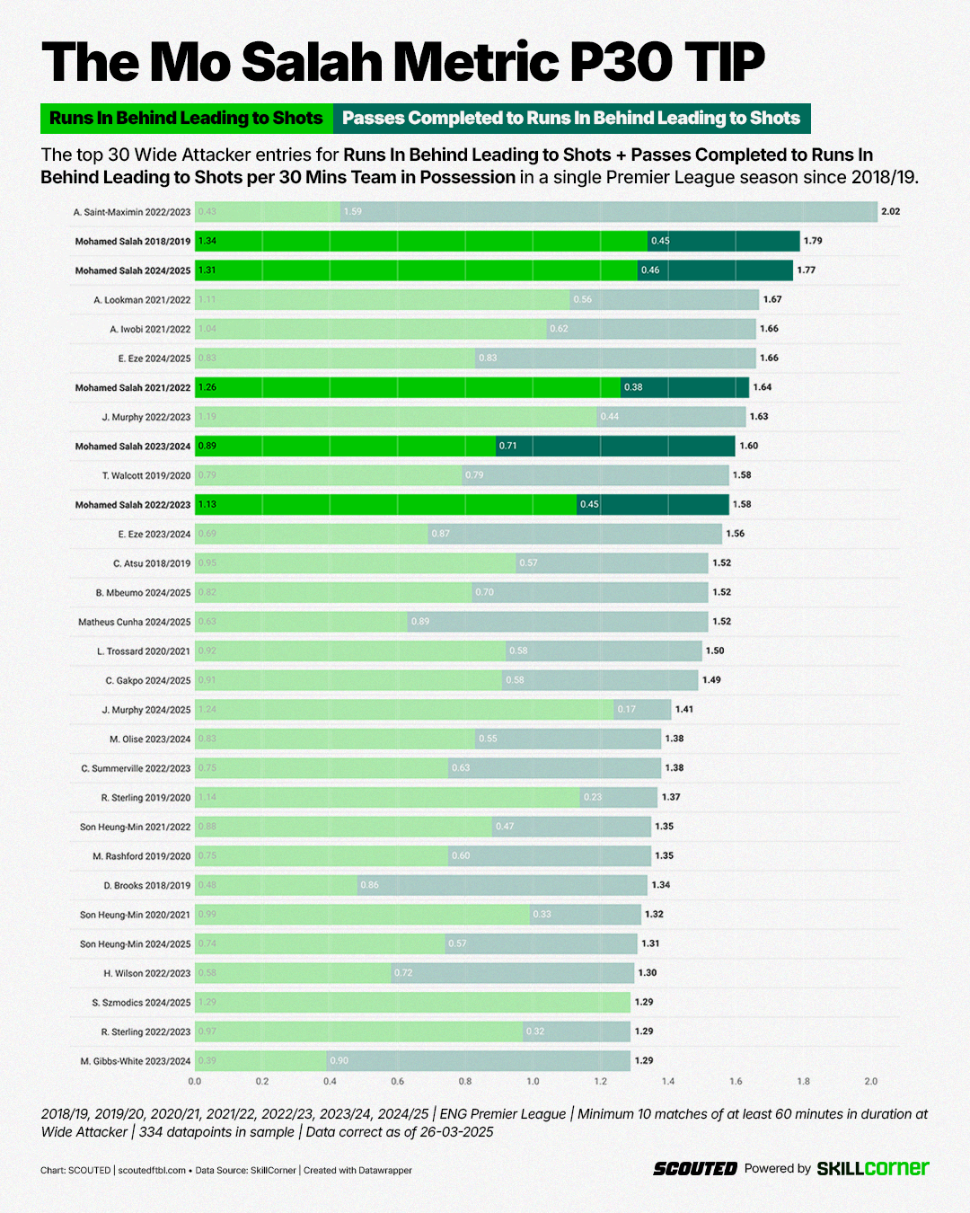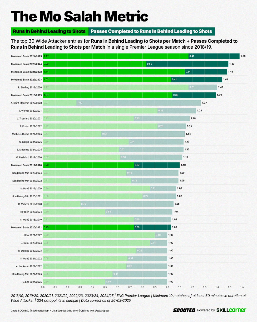 Among 334 Wide Attackers in the Premier League since 2018/19, only nine players rank in the top 10% for Runs In Behind Leading to Shots per Match and in the top 10% for Passes Completed for Runs In Behind Leading to Shots per Match in a single campaign. Mohamed Salah is responsible for three of his entries: 2022/23 Salah, 2023/24 Salah and 2024/25 Salah. When combining these two metrics, Salah is responsible for each of the top four tallies. All seven of his seasons in this timeframe make the top 30.