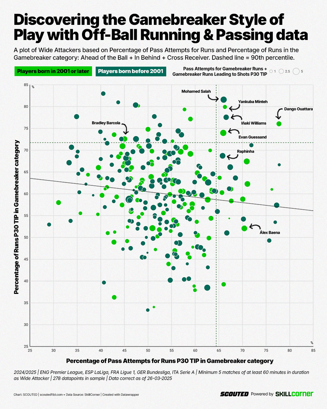 The segment in the top right of the graph below contains the five players that rank in the top 10% for Gamebreaker Share of both Off-Ball Running and Passing: Mohamed Salah, Iñaki Williams, Dango Ouatarra, Evann Guessand and Yankuba Minteh.