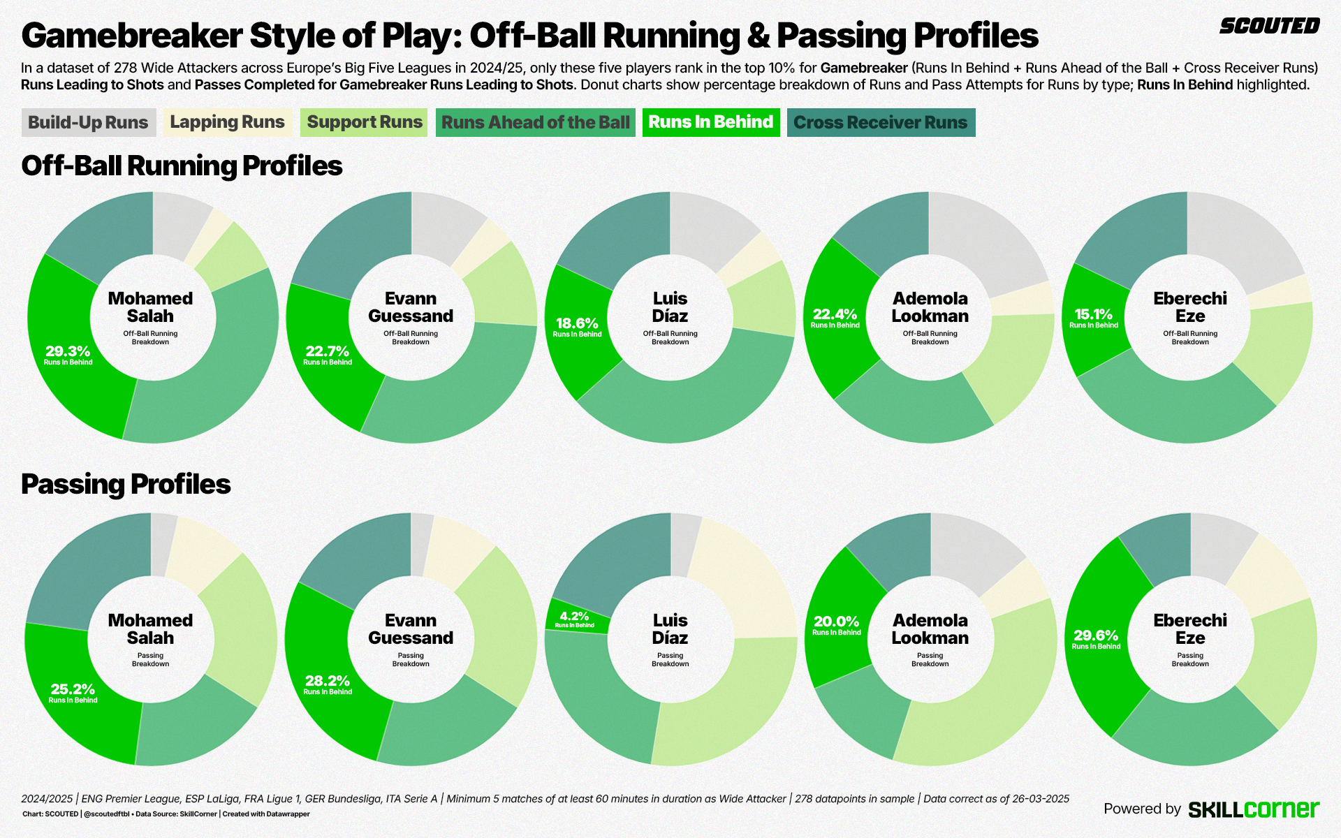 Salah and Guessand are the only two that rank in the top 10% for Percentage of Pass Attempts for Runs and the Percentage of Runs in the Gamebreaker category. Meanwhile, the intent to break the last defensive line with both Runs and Passes is the calling card; Salah and Guessand rank in the top 15% for Runs In Behind as a percentage of both their Running and Passing profiles.