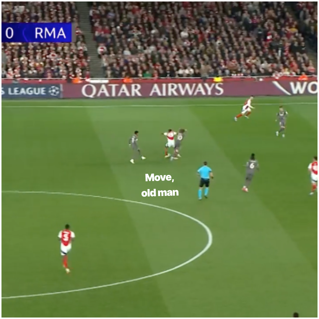 - This is my favourite bit: MLS uses his right arm to lever his body between an enclosing Modrić and the ball, brushing him out the way…