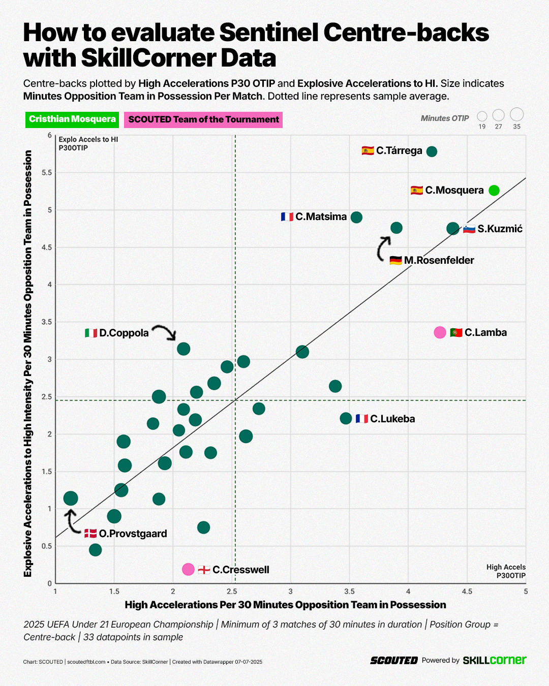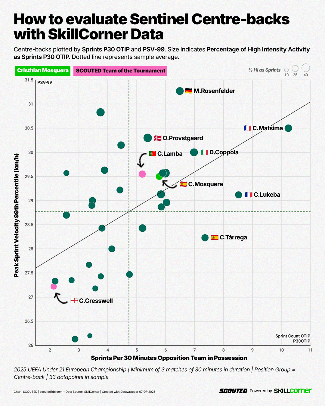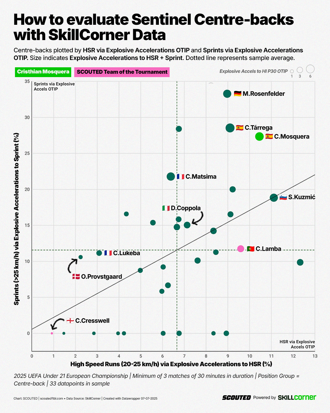 In SkillCorner terms, we should expect to see a large number of Sprints, a high Percentage of High Intensity Activity as Sprints, plenty of Explosive Accelerations to Sprint and a high Percentage of Sprints reached via Explosive Accelerations. For comparison and contrast, I will highlight both Charlie Cresswell and Chico Lamba in all the data visualisations we use, as they were our Team of the Tournament’s centre-backs. The latter has recently signed for Saint Étienne.