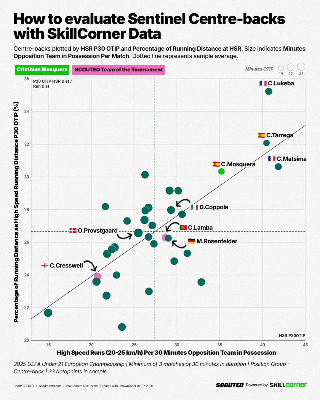The data suggests Mosquera’s leggy and lean build lends itself to High Speed Running (20 km/h to 25 km/h) as opposed to Sprinting (>25 km/h), at least in this tournament. He ranks above average for PSV-99 and Sprints P30 OTIP - but he is not an outlier like French centre-back Chrislain Matsima or Germany's Max Rosenfelder - the latter missed the final due to a hamstring injury, go figure.