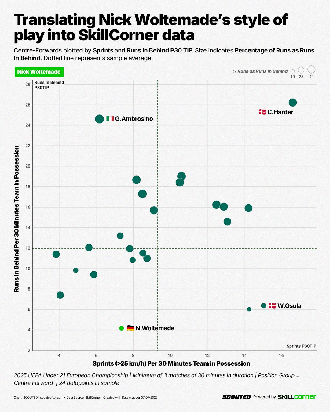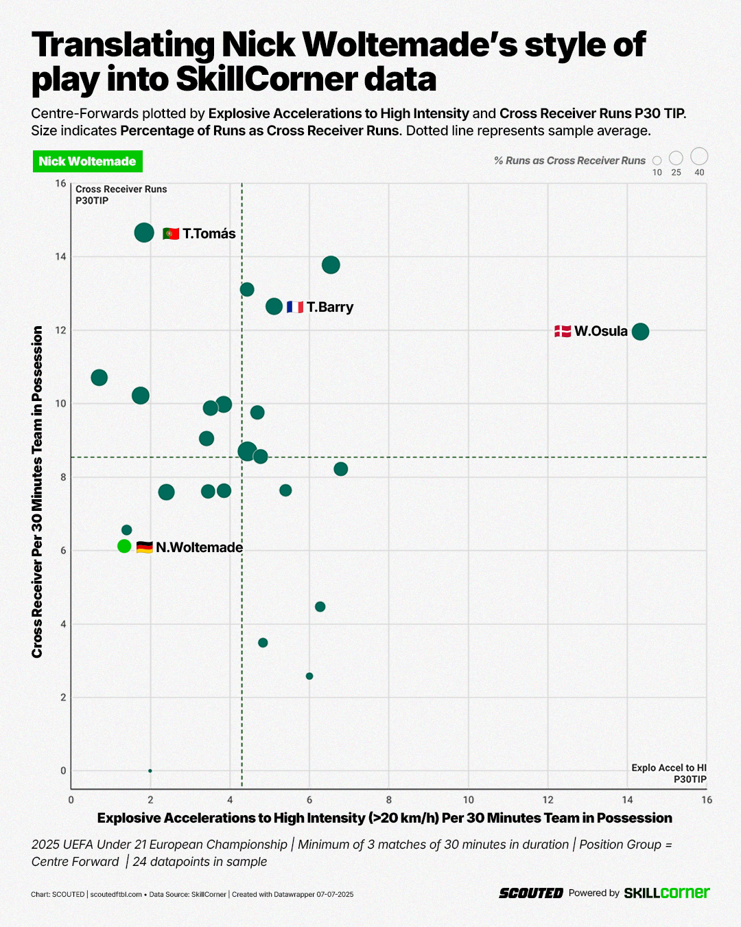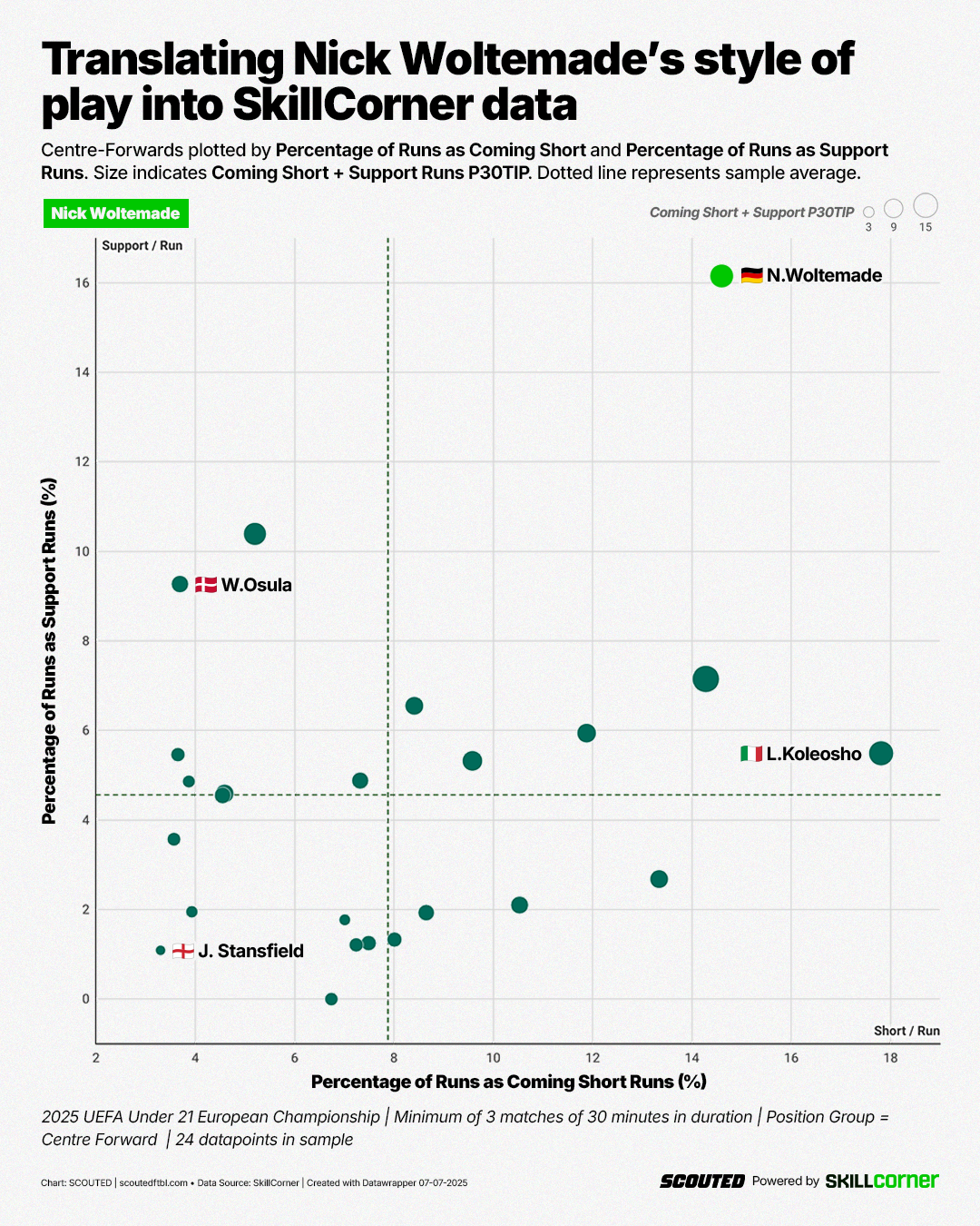 Nick Woltemade was undoubtedly the standout Centre Forward at the tournament. He scored the most goals and even provided the most assists. But he has always been difficult to define as a player: he dribbles often but he does not run hard; he’s massive but does not continuously throw himself at crosses - the source of his domination is elusive. Watching him closely at this tournament, however, has led me to a discovery.