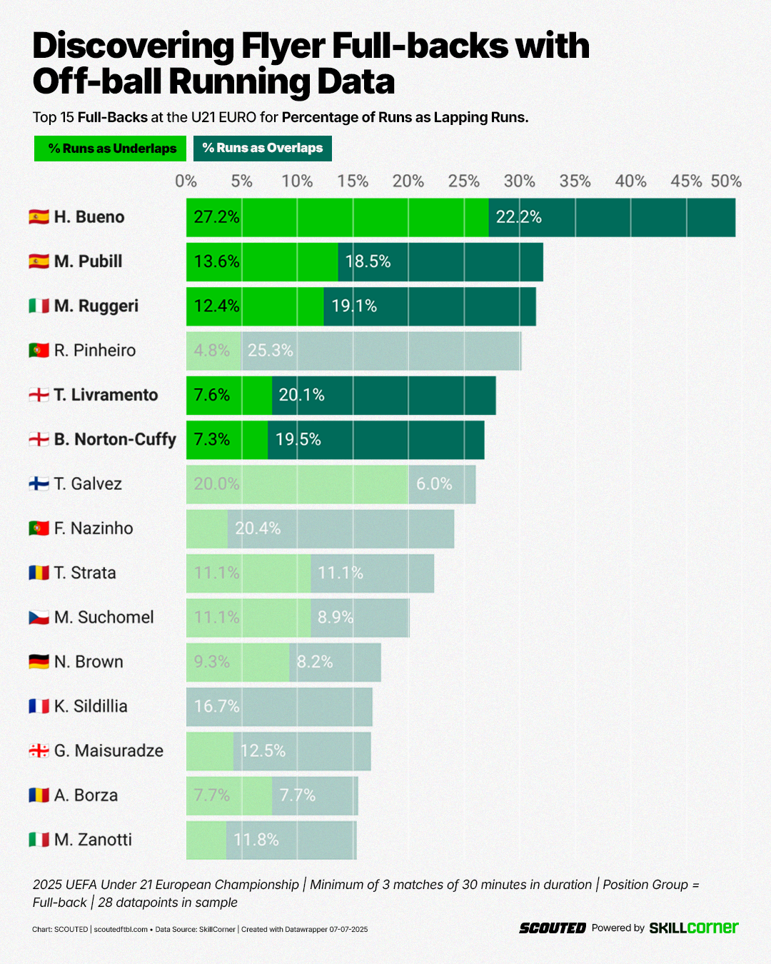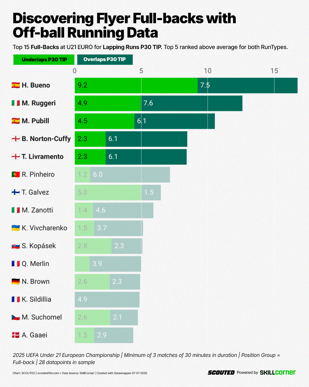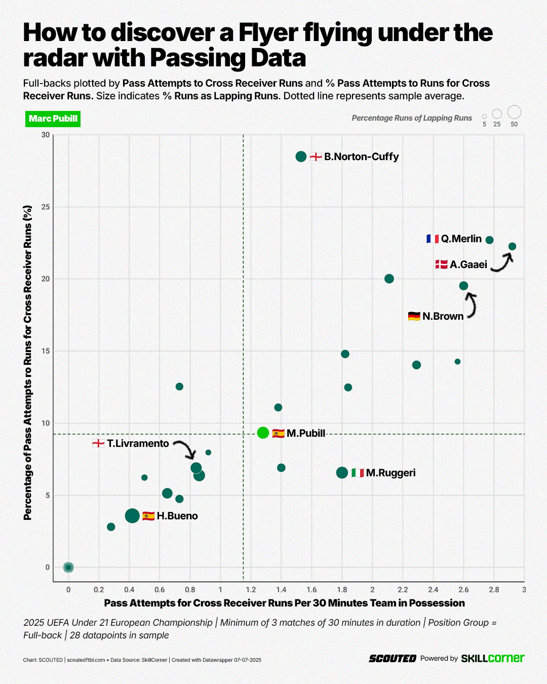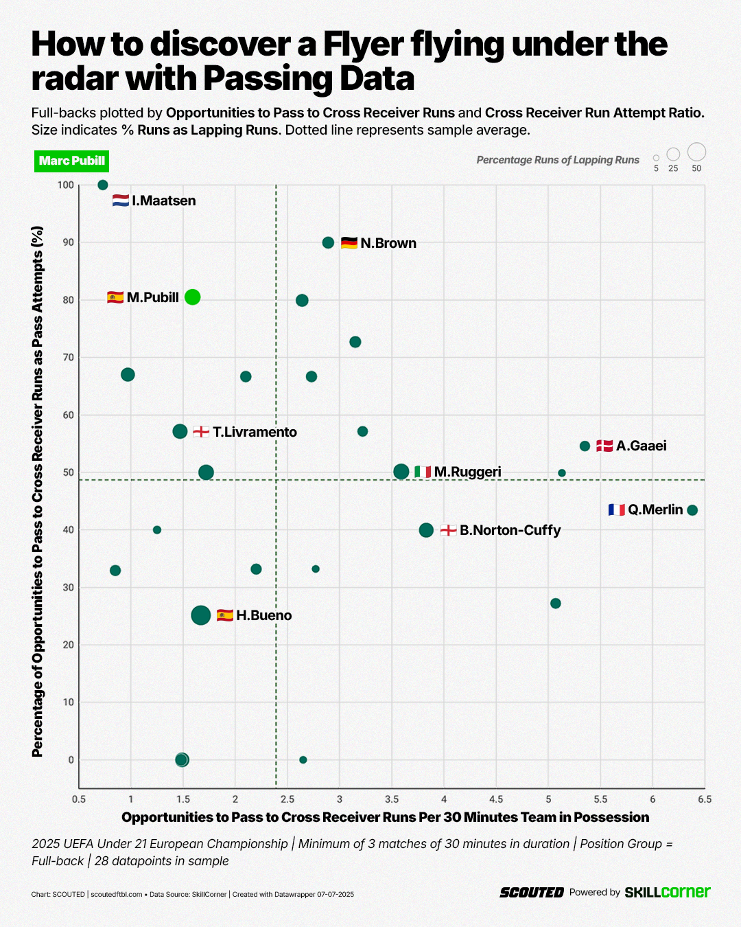 Pubill was one of five Full-backs that ranked above average for both Overlaps and Underlaps P30 TIP during the tournament. That’s a tick for substance. The fact he ranks second for the Percentage of Off-Ball Runs made as Lapping Runs is a tick for style, too.
