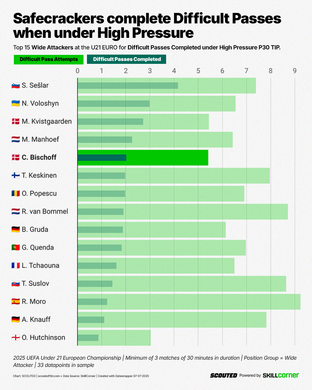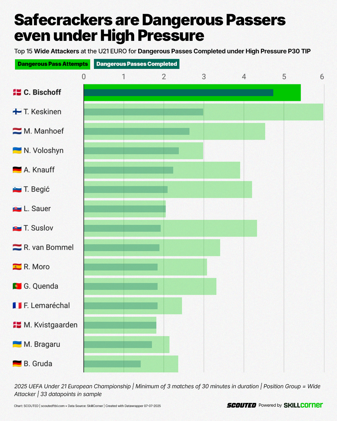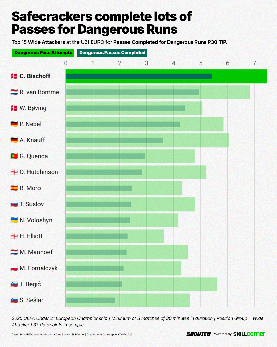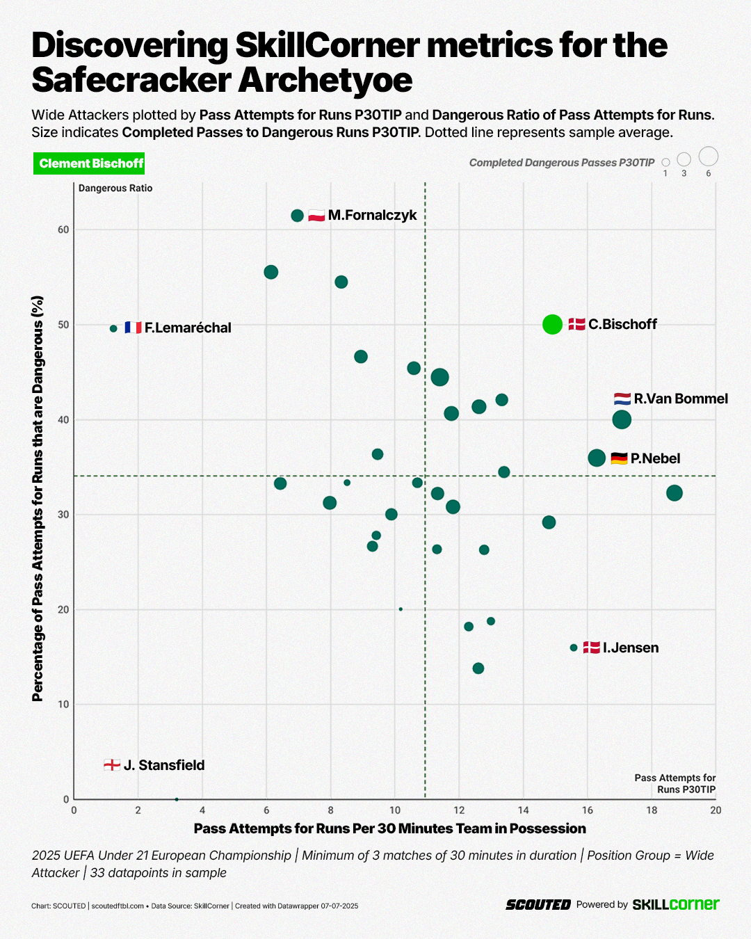 In SkillCorner data, Bischoff stood out for Dangerous Passing; a true Safecracker. He ranked first for Opportunities, Attempts and Completed Passes to Dangerous Runs P30 TIP.