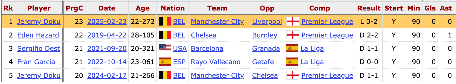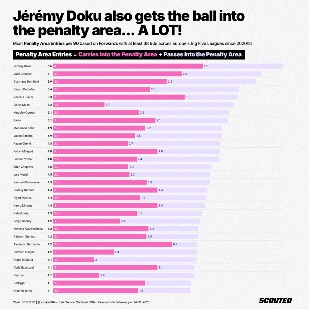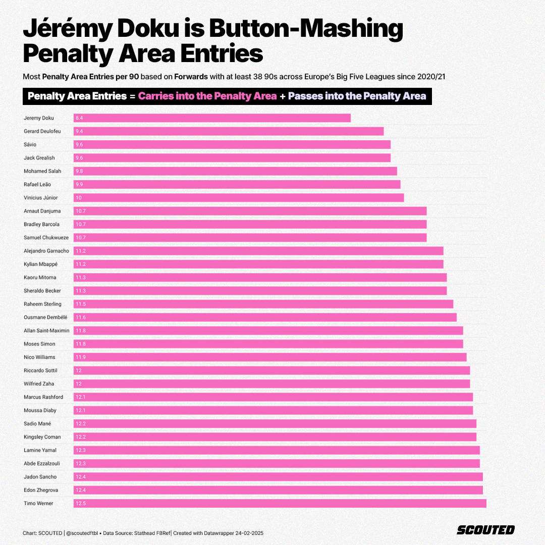 Moving on to ball-carrying, Doku’s 23 Progressive Carries - which include all Carries into the Penalty Area - is the most recorded in a Big Five League game across the past eight seasons. Doku broke Eden Hazard’s record and became the only player to record 20+ multiple times, first doing so against Chelsea in February last year.