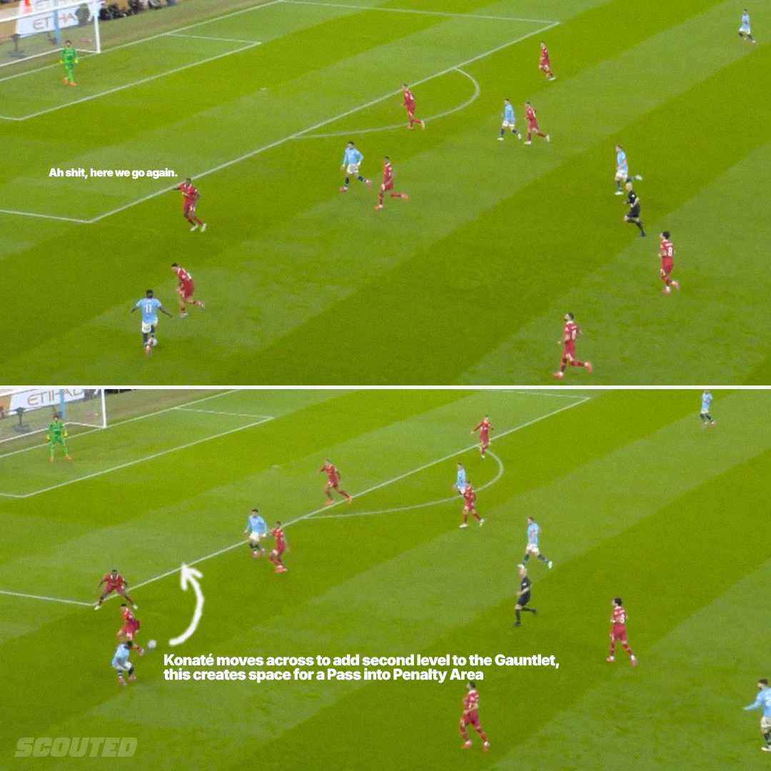 Marmoush is intelligent enough to move into that gap - this was the only shot City’s No.7 registered inside the box. The fact that Doku spotted and picked out his run instead of defaulting to his dribbling is what makes me believe he will discover the end product currently missing. In fact, the City duo attempted to combine in this fashion a few times during the game. But it was not until Konaté over-compensated that enough space to execute the pass appeared; the space was created by the threat of Doku's ball-carrying. Without that, Konaté does not take his place as the final boss of the Gauntlet and intercepts the pass.