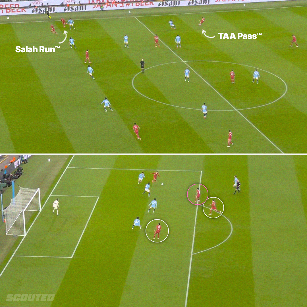 Take Salah’s assist. The Egyptian makes a trademark burst in-behind and is found with a trademark pass in-behind by Trent Alexander-Arnold - TAA’s ability to do this is why I would not not care how many times he gets dribbled past. Salah then uses his hulking strength to protect the ball from Gvardiol, gain full control of it and then carry it into the City box. No take-ons needed. His passing options take the form of Szoboszlai’s supporting run, a box-crashing Curtis Jones and a far post Luis Díaz: this creates is a 4-v-4 inside the penalty area. You know what happens next. The process for Salah getting the ball into the box and providing the assist for Szoboszlai were: Run In Behind + Received Pass In Behind + Carry into the Penalty Area.