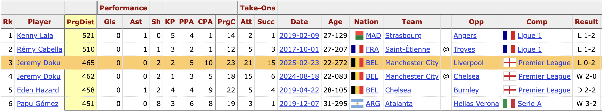 I mentioned in the SCOUTED Stats section that Doku broke his 2024/25 single-season record for Progressive Carrying Distance, it turns out this is a Stathead-era Premier League record by a forward. Across Europe’s Big Five Leagues, only Rémy Cabella and Kenny Lala have broken the 500-yard threshold. You will notice Hazard once again pops up, too.