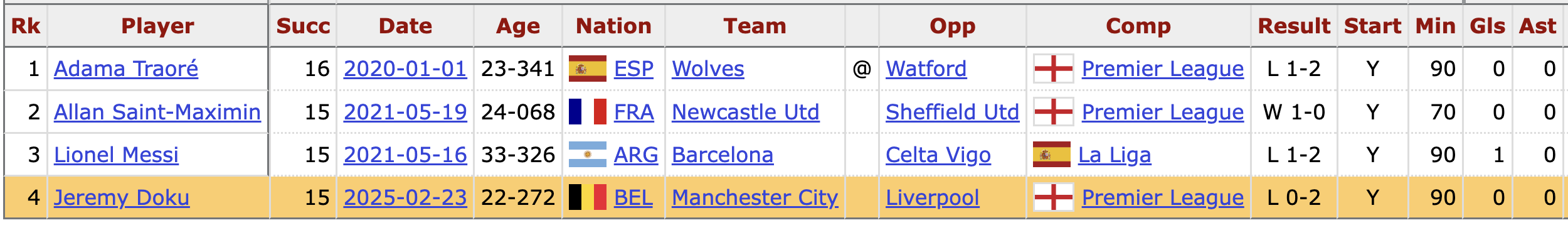 First, it is important to try to comprehend just how much dribbling Doku is doing. Against Liverpool, he became the youngest player since 2017/18 to record 15 Successful Take-Ons in a Big Five European League game. In fact, only three other players across all ages have done it - one of them is Lionel Messi.