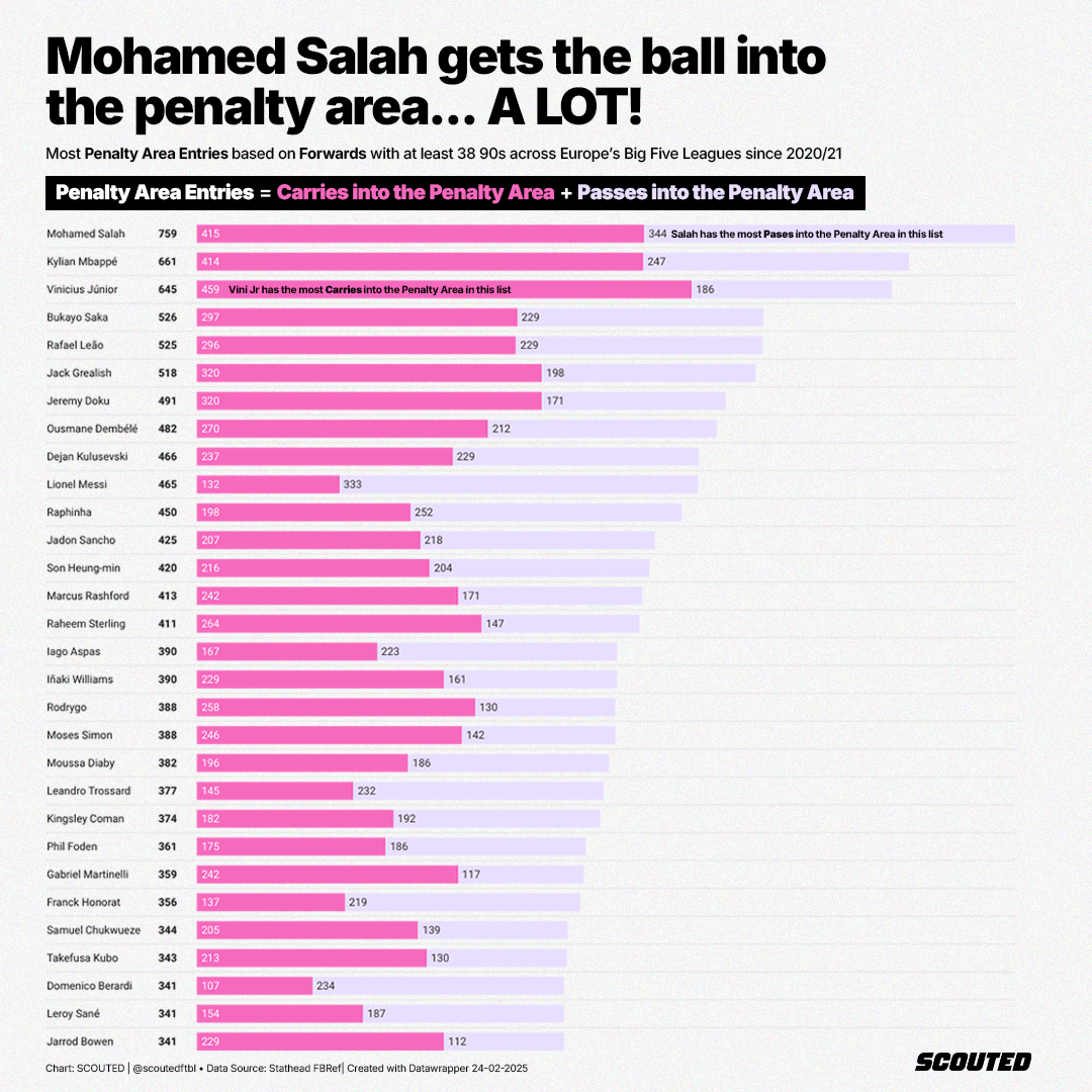 Despite Doku recording 6.6 PenEntries per 90, each one is delivering just 0.05 NPxG+xAG. Towards the other end of the size spectrum is Mohamed Salah, of course. Salah not only averages 4.9 Pen Entry per 90 - a 98th percentile figure from out 536-player dataset - but each one is worth 0.17 NPxG+AG - three times more than Doku. This takes us back to all of the points made about the anatomy of each player's Penalty Area Entries in the Doku Dilemma section. To explore that with data, we will have to wait for the SkillCorner deep dive. Stay subscribed!