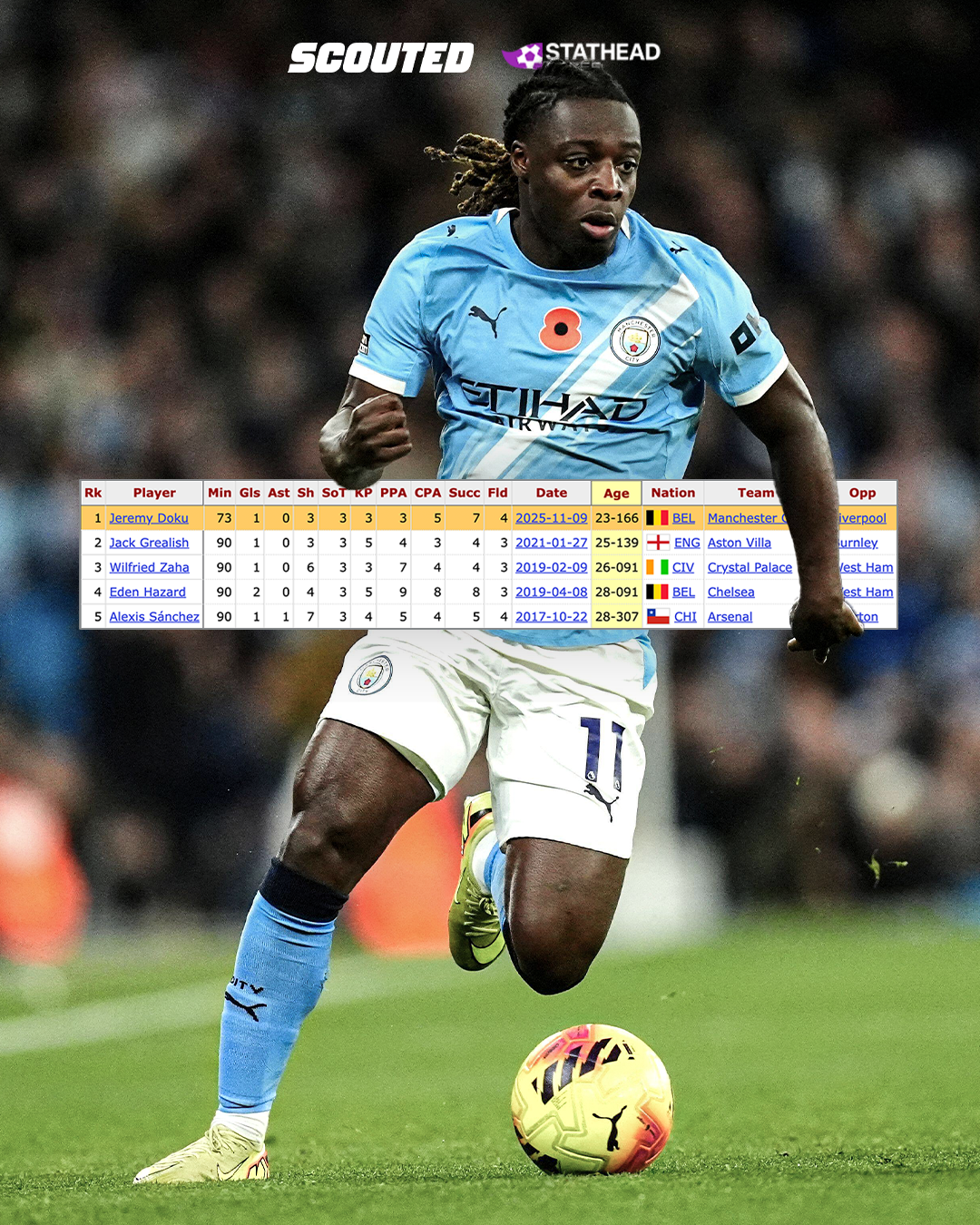 This time, Jérémy Doku recorded 3+ Shots, 3+ Key Passes, 3+ Carries into the Penalty Area, 3+ Passes into the Penalty Area and 3+ Fouls Drawn for the first time in a top-flight league game.