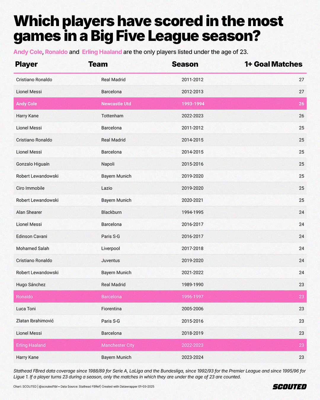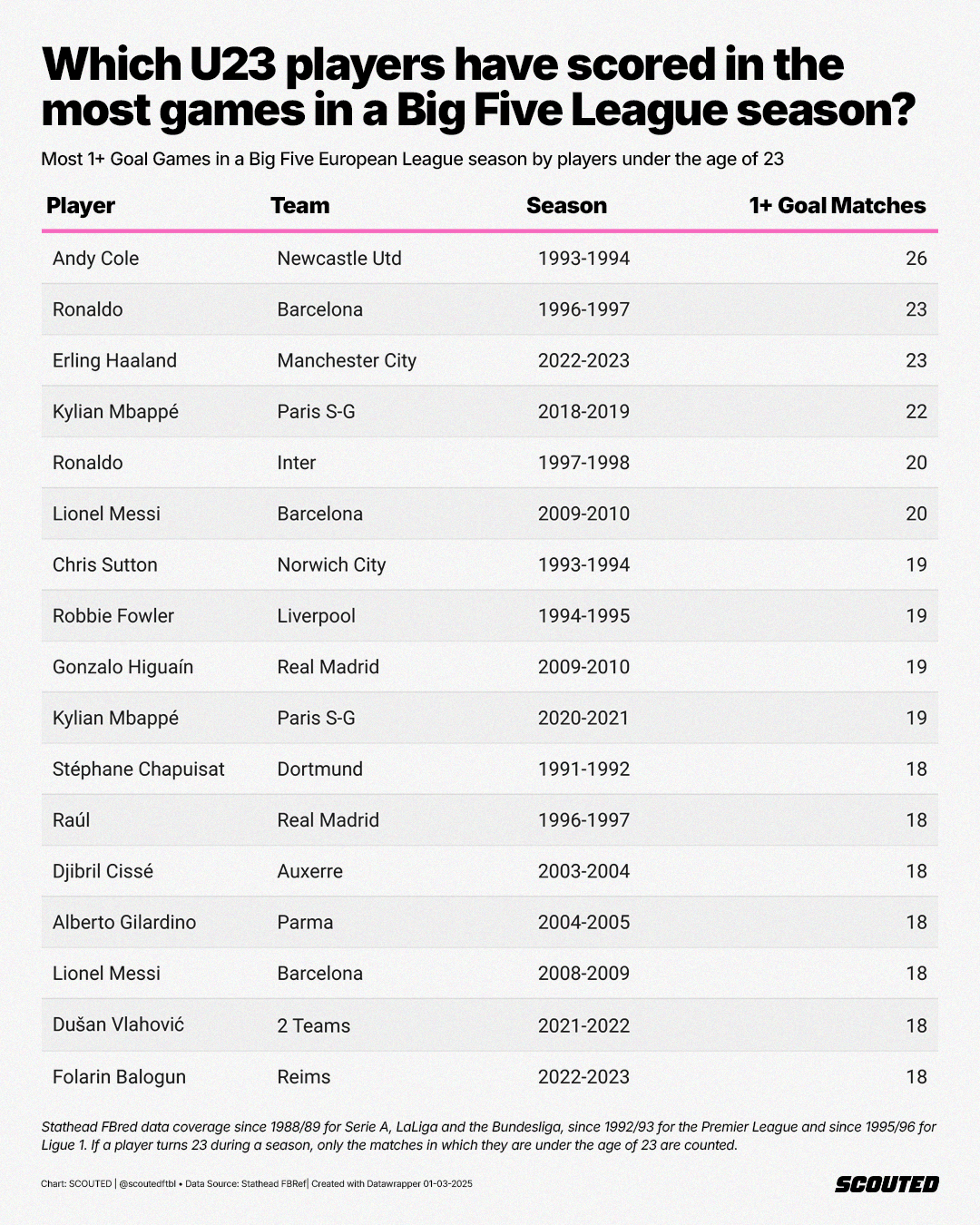 As is now the custom, we begin with your update for the best single-game tallies recorded by players under the age of 23 across Europe's Big Five Leagues in 2024/25. All records are based on that criteria unless stated otherwise. I have also tested a new format this week as I am writing too much for the ‘Callout’ feature.