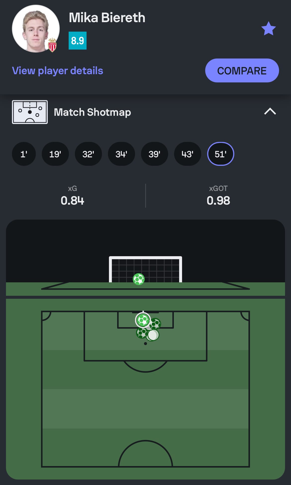 To confirm: there SEVEN shots in that image - that’s also how many passes he completed. As I highlighted in SCOUTED Stats, these seven shots generated a Non-Penalty Expected Goals total of 3.0. Since the start of the 2017/18 season, only six players have generated 3+ NPxG in a single Big Five League game. The only player to do so at a younger age than Biereth is a 20-year-old Kylian Mbappé at PSG. This is premium Goal-Hanger territory.
