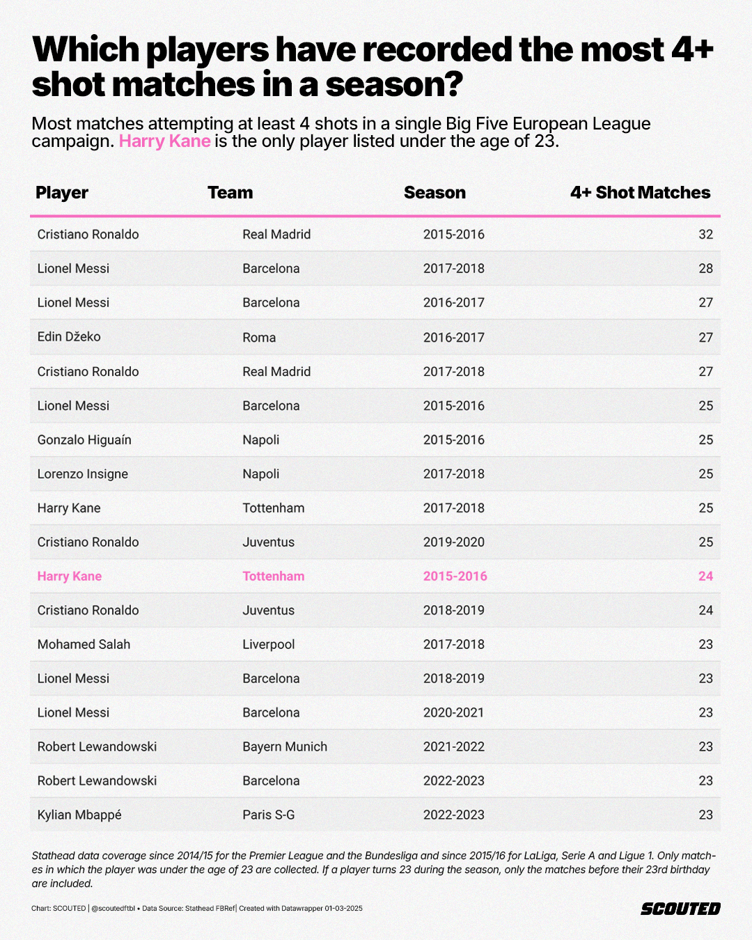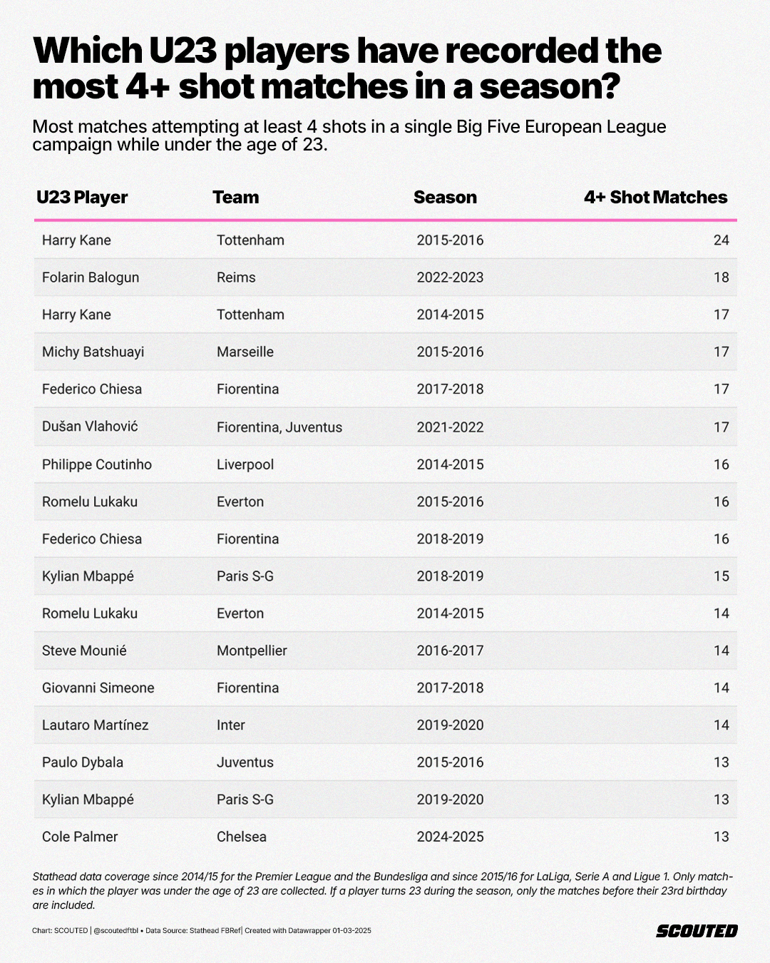 This led to a thought: is it better to evaluate strikers based on a Games with X Shots criteria than Shots per 90? By looking at the percentage of matches a player registers your golden number of Shots, you could weed out stat-padders or streaky shooters. It might not be better, but it could be a valuable exercise to undertake as the final part of the recruitment process. To run with this, I pulled the most 4+ Shot Matches in the Stathead database across all ages and then for Under-23 players only. Here are the results.