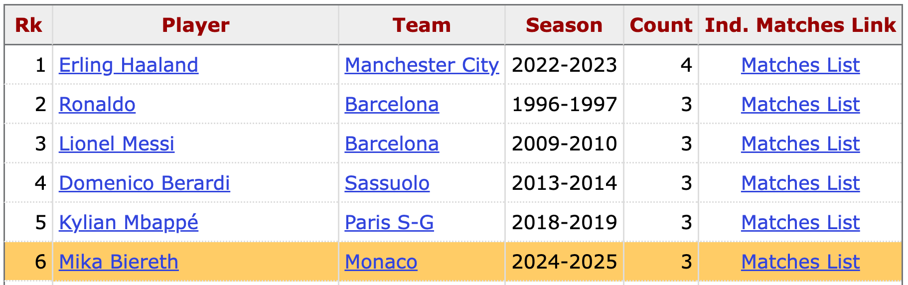 As alluded to in the SCOUTED Stats section, this was Biereth’s third Ligue 1 hat-trick - he’s completing one every 187 minutes of average in Ligue 1. According to Stats Foot, Biereth is the only player in the past 70 years to complete three hat-tricks within their first seven appearances in the competition. To try to find out just how mad this was, I booted up Stathead.