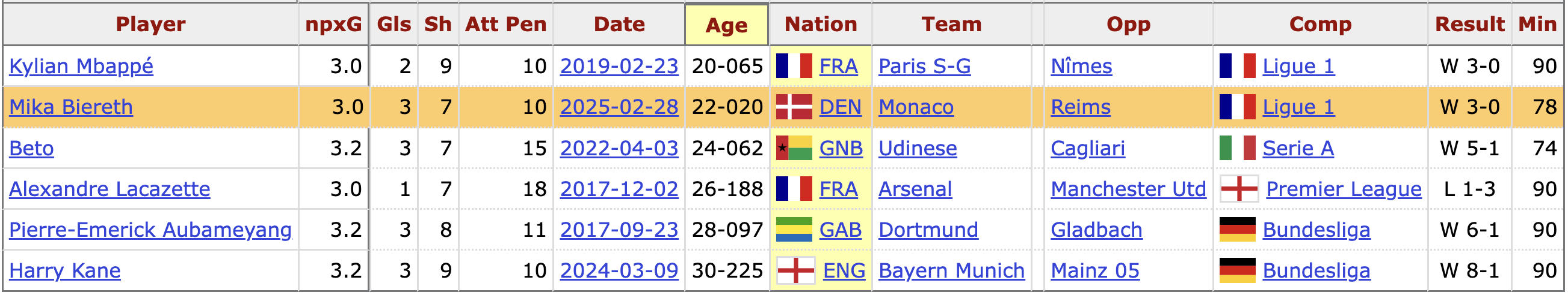 Biereth is the 49th player on the Stathead database to complete a hat-trick of hat-tricks within a single Big Five European League season - reminder, he joined that list after his first seven games in such a division. In fact, the Dane is just the sixth player to complete a hat-trick of hat-tricks in a single Big Five European League campaign wile under the age of 23. It's quite some list.