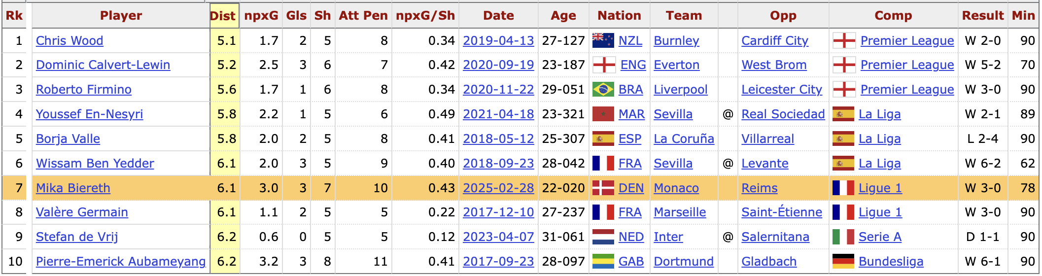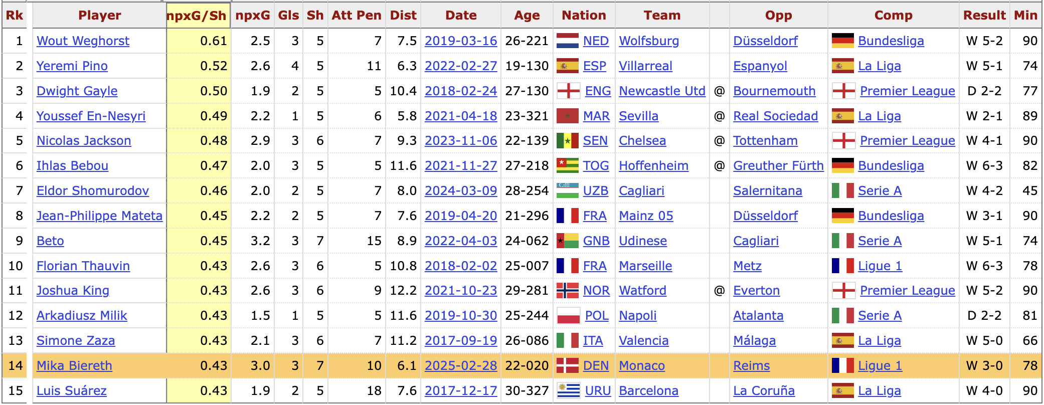The combination of Shot Quanity and Shot Quality is the Holy Grail for the Goal-Hanger Archetype. Each Biereth shot against Reims was worth 0.43 NPxG on average and was taken from an average of 6.1 yards out. Dealing with the NPxG/Shot tally first, this puts Biereth in the top 50 on the Stathead database for highest NPxG/Shot from players to attempt 4+ shots in a Big Five League game. If we move the needle to 5+ shots, he ranks in the top 15, pictured below.