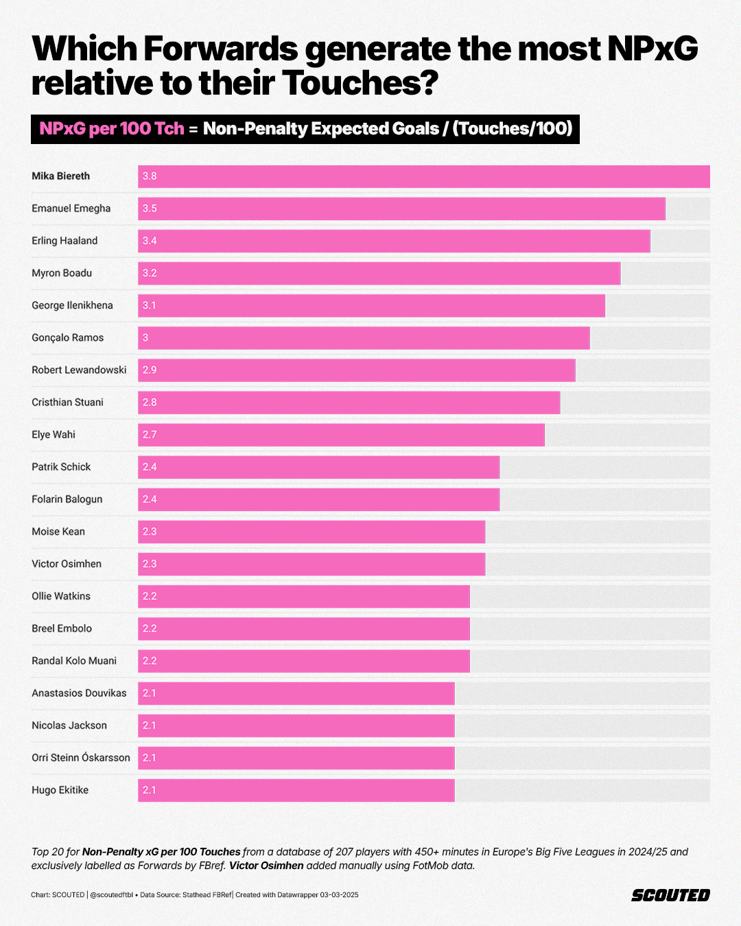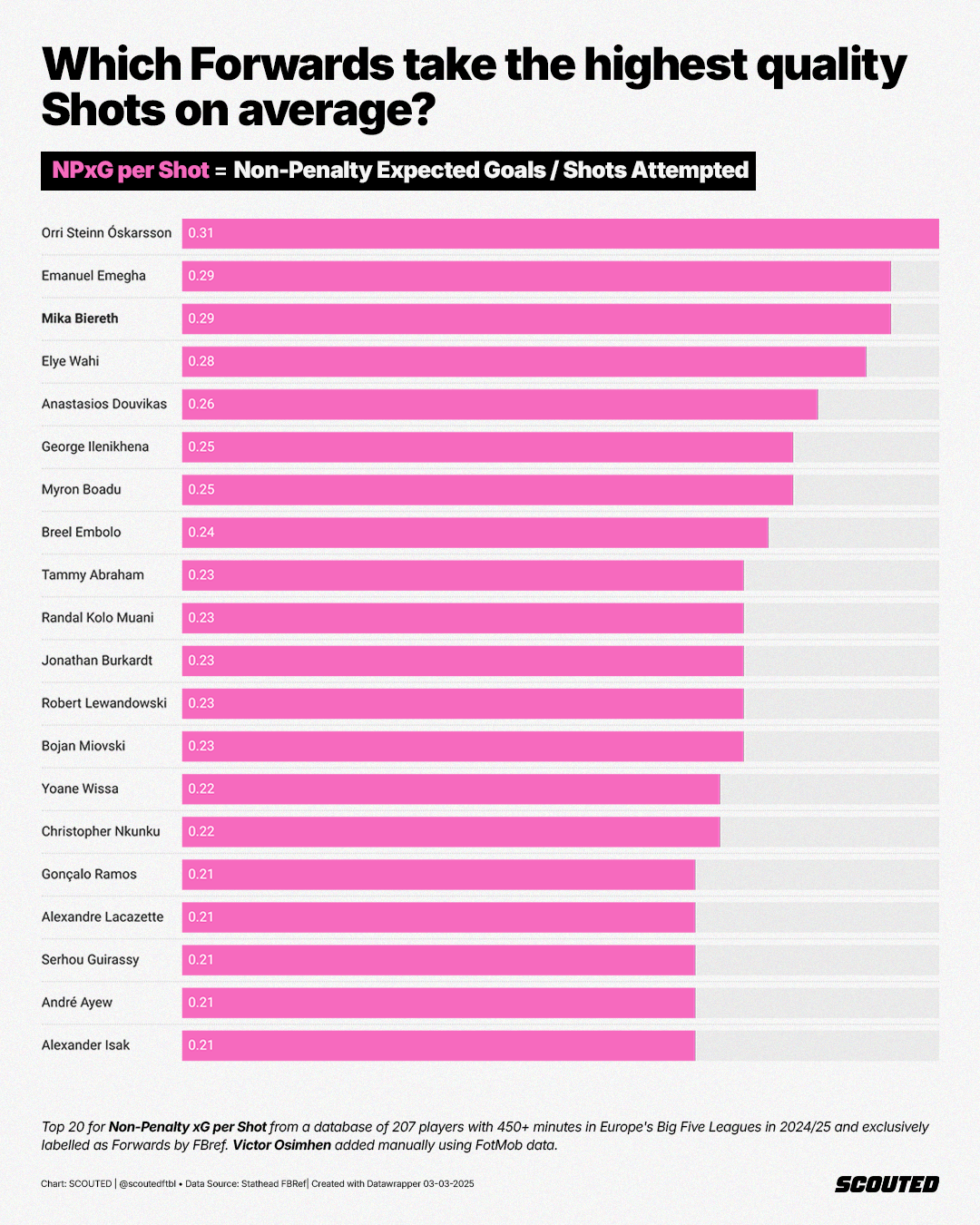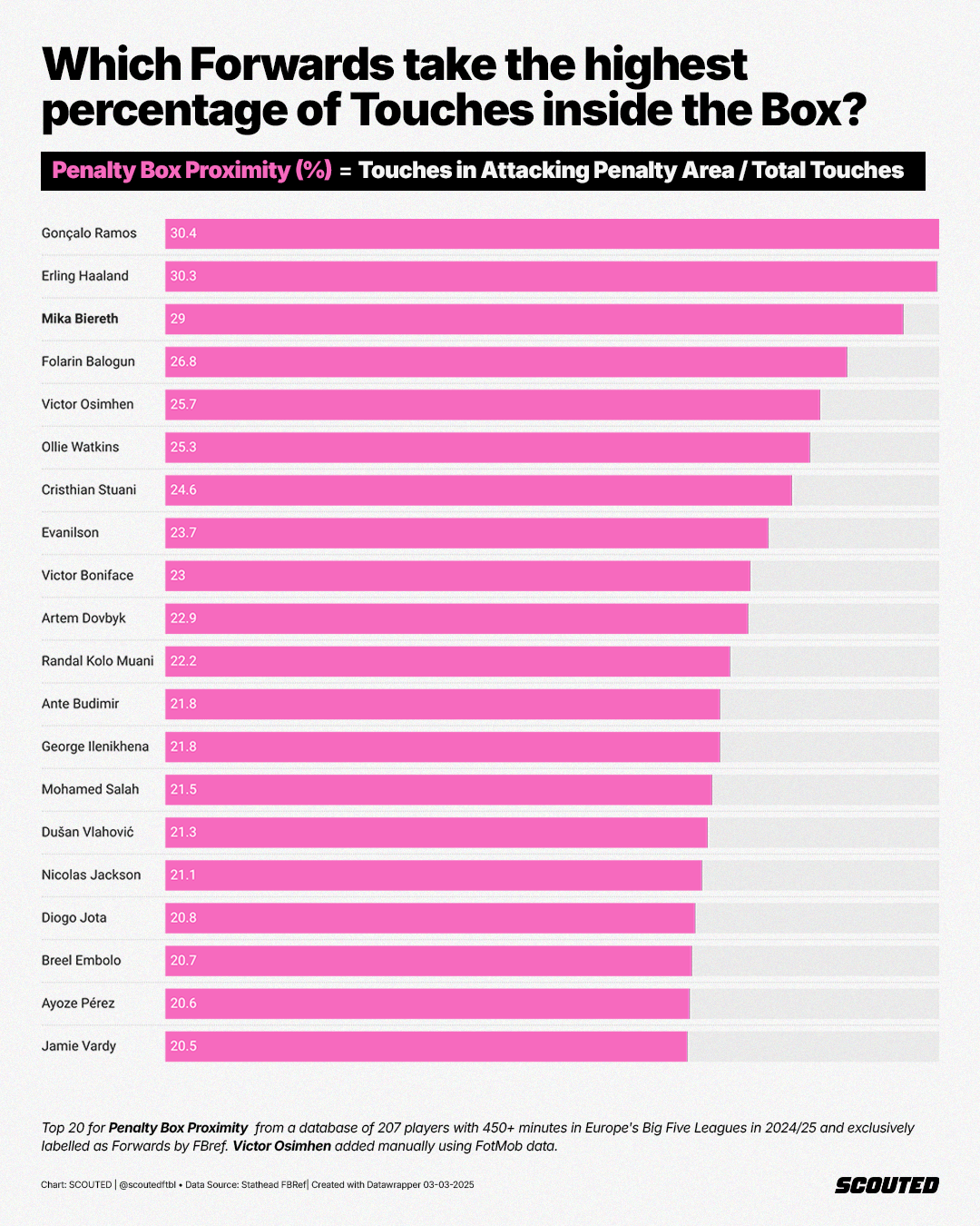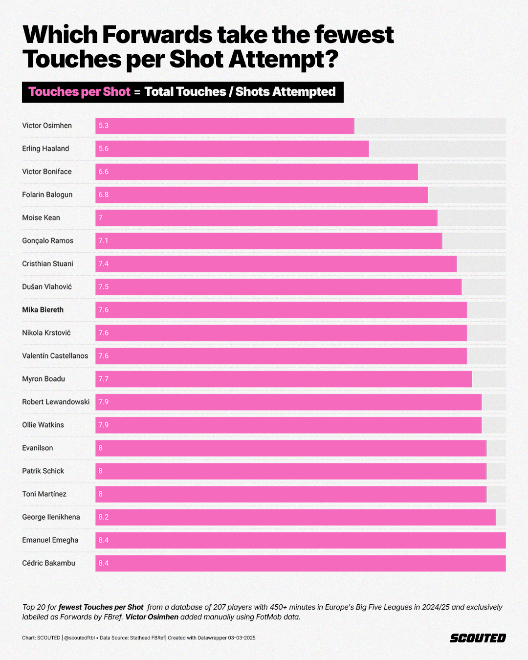 The image gallery below displays the top 20 for: fewest Touches per Shot, highest NPxG per Shot and highest Penalty Box Proximity; Mika Biereth, from his limited sample, ranks in the top 10 for all three metrics.